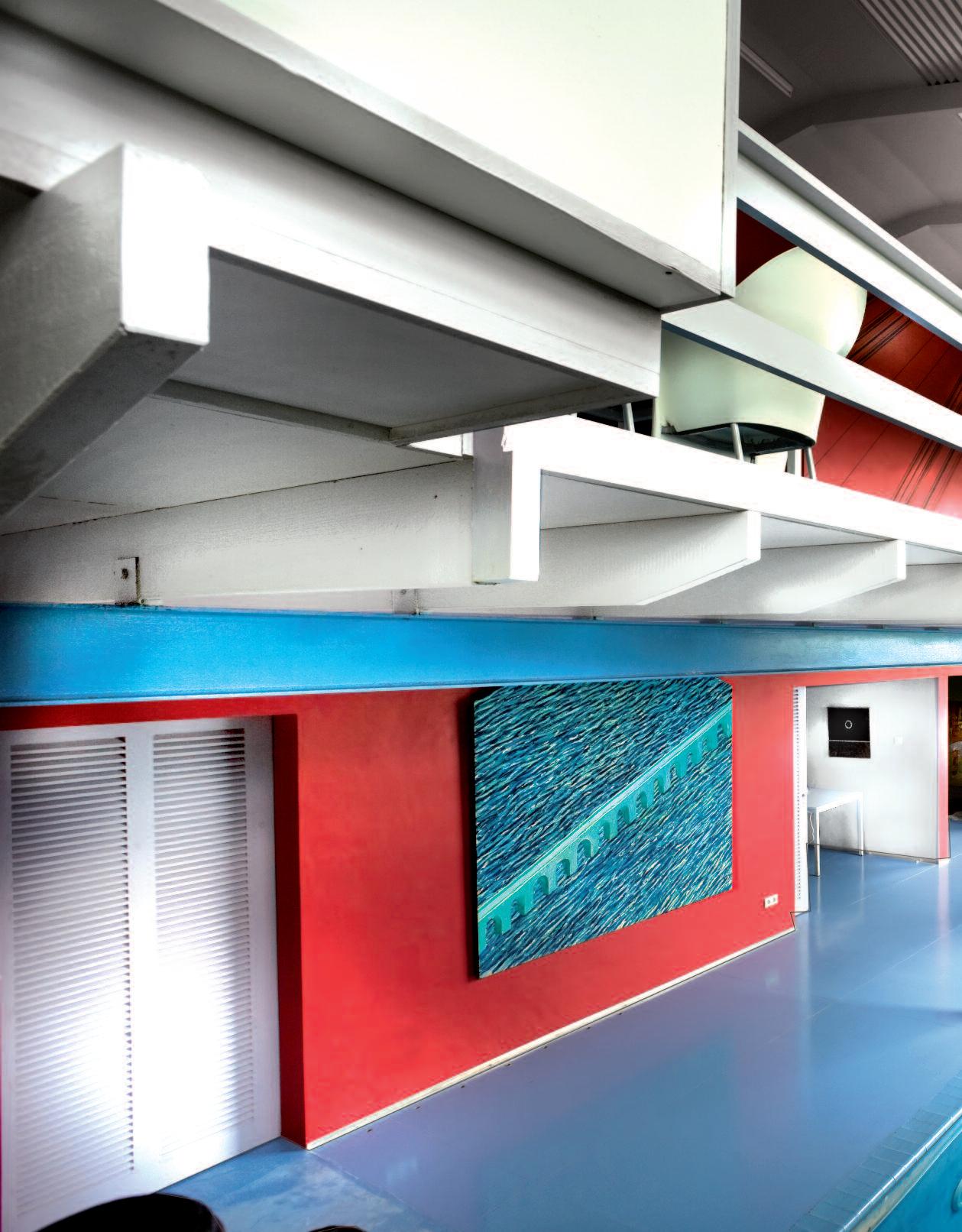 Adjacent to the bedroom is the study, separated by a glass partition The study is equipped with a blue lacquer cabinet with double retractable doors, concealing a small kitchen finished in red oak veneer and Calacatta countertops The desk is set against a backdrop of a Cumellas rug and Jo Hummel’s artwork from the Victor Lope gallery