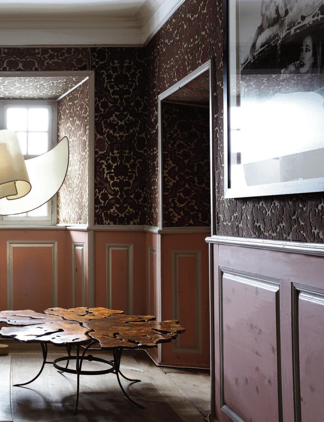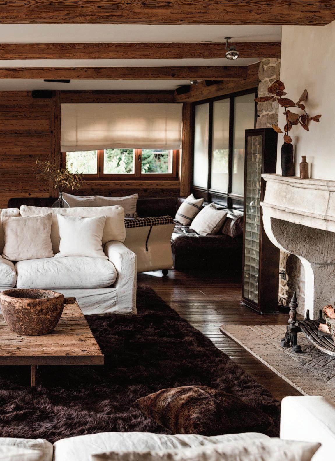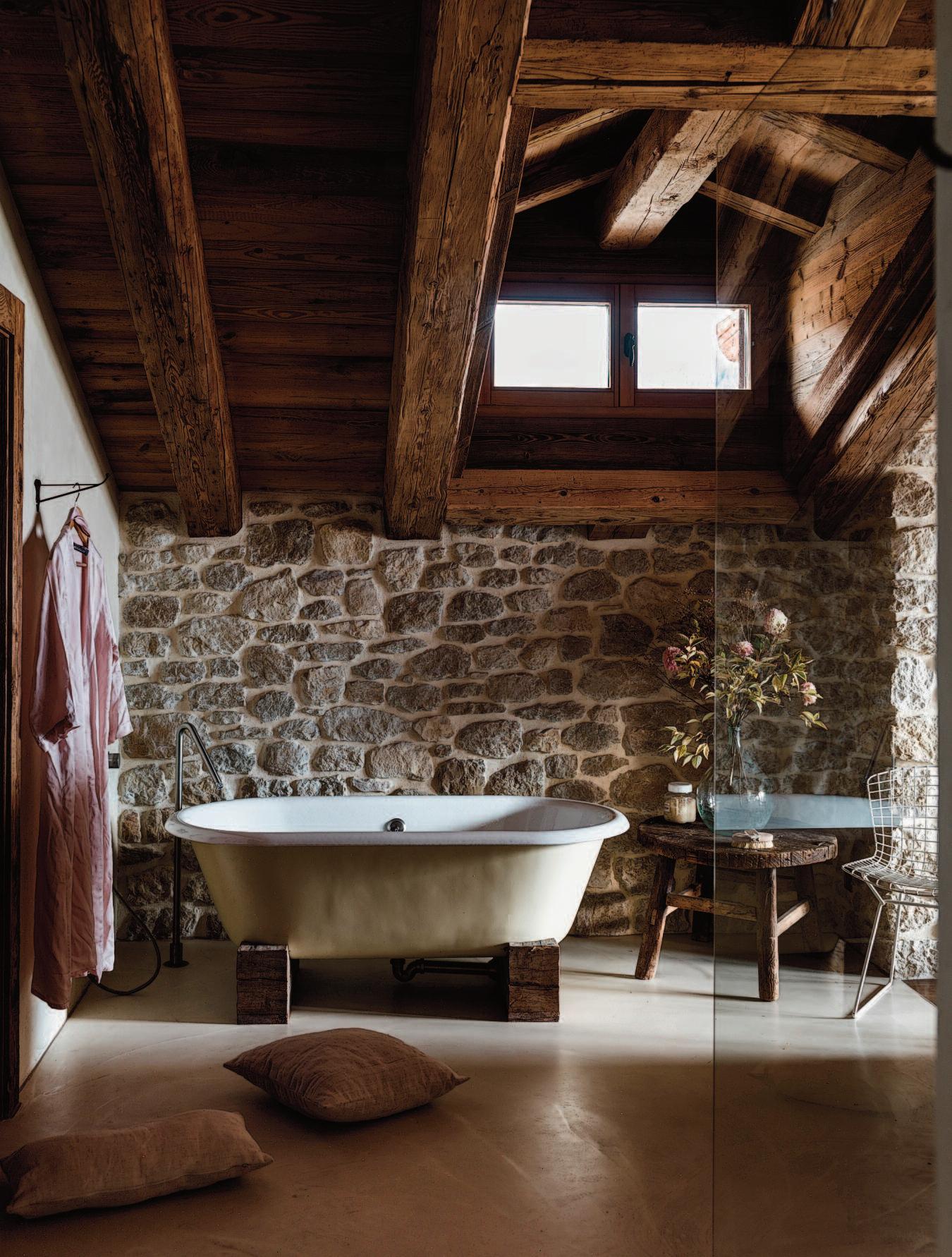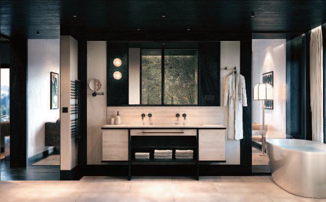 These pages: throughout the project, the materials have been selected to age naturally over time . The walls are covered in mineral-based limestone paint and finished with cladding from dismantled alpine barns. The palette includes a range of neutral tones, with an emphasis on ear th browns and soft creams.