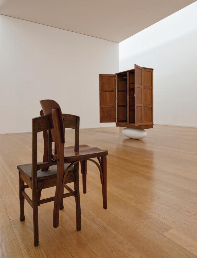 Top left: The Relief, 2023 by Tarik Kiswanson (R. Gabriel 1945) in the Swedish Institute in Paris. In the foreground ‘Foresight’, 2024. A 1945 chair by George Nakashima—an architect interned in detention camps in the Idaho desert during the Second World War intersects with a chair from the same year designed by Adolf Gustav Schneck, a German architect affiliated with the Nazi Party.