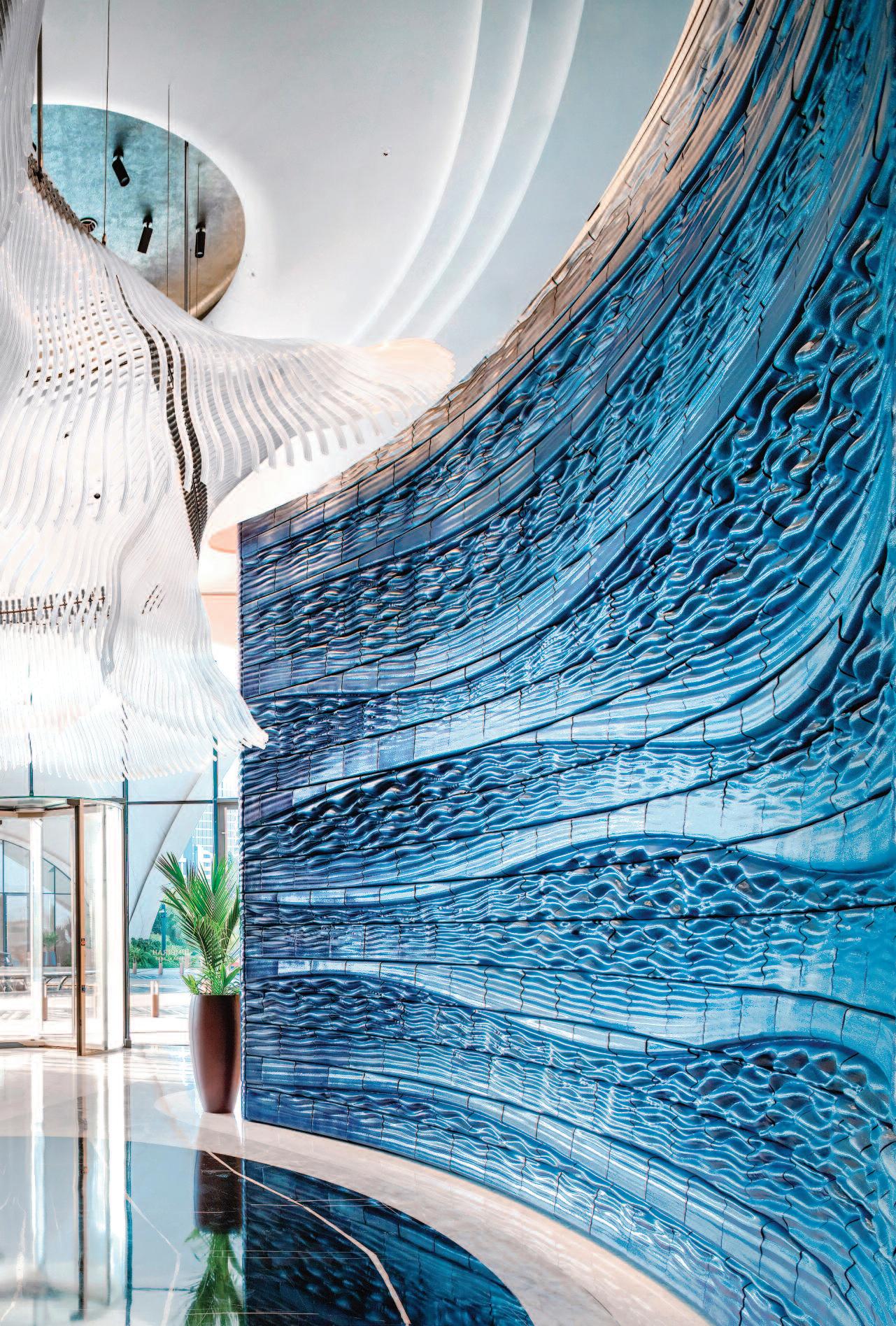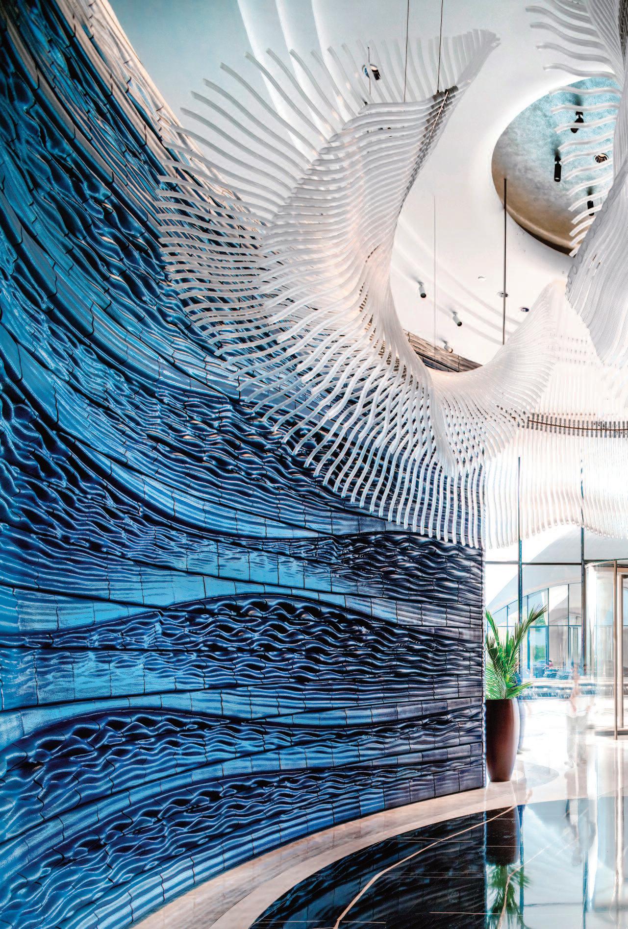 Bl ue Voyage draws its inspi ration from the nearby Gul f at Jumei rah M arsa Al Arab i n Dubai. Its sw eepi ng, curved form s evoke the rhythm of ocean waves, whil e intri cate surface patterns reveal them sel ves upon cl oser vi ew –flowi ng li nes and l ayered ridges that i nteract dynam icall y wi th l ight and shadow throughout the day.