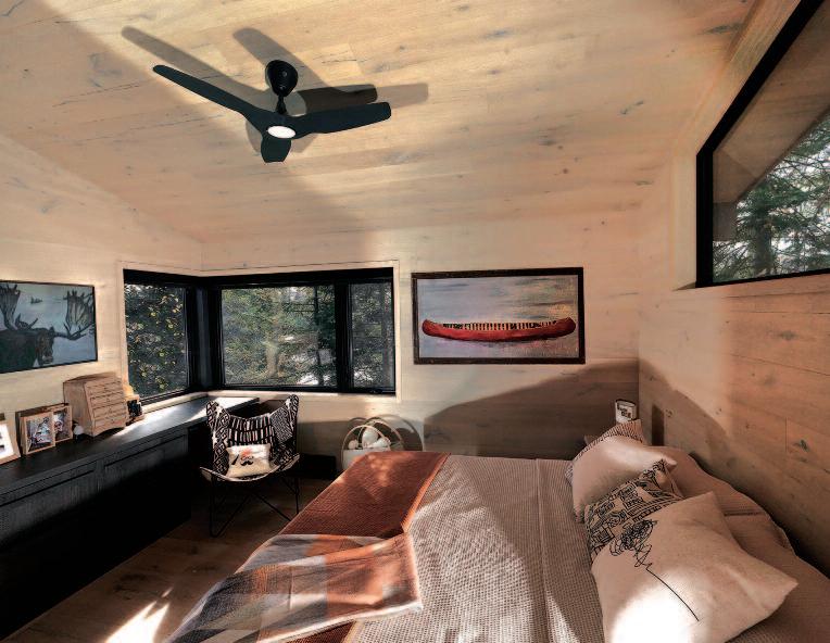 These pages: the sleeping quar ters, where wood finishes and natural tones continue the seamless fusion of moder n design and rustic authenticity. The design team incorporated raw materials wire-brushed plank flooring used as wall cladding, hammered stone in the outdoor areas, and cerused oak paired with metallic bronze millwork—to echo the surrounding natural beauty.