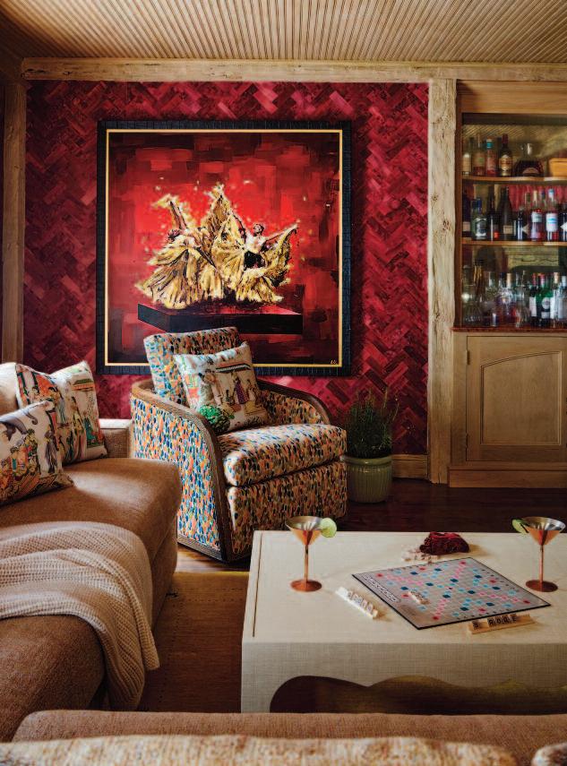 These pages: the chalet’s main living area, kitchen, and dining space. The palette features an ear thy architectural foundation enriched with vibrant bur nt orange accents, sage greens, classic plaids, and textured neutrals—culminating in a cozy, mountain-inspired atmosphere. The space was envisioned as a welcoming hub for a family to gather under one roof.