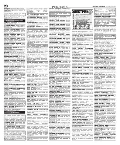 (8) ЦЕМЕНТ, ЩЕБЕНЬ, ПЕСОК , ОТСЕВ, КЕРАМЗИТ, ГЛИНА. КОПАЕМ КОТЛОВАНЫ. Тел. 6 13 84, 8(067)169 17 17. А . Тел. (10) С АНТЕХР АБО ТЫ, ПЛИТК СА РА ОТ КА 6 46 67, (094)956 66 67. (11) ГГипсок ипсок а, покраска. ипсокаа рртт он, шпаклевк шпаклевка, Декоративные потолки любой сложности. Ламинат, дикий камень, плитка. Тел. 6 14 99, (067)768 41 87. (12) Бетонные работы. Кладка, штукатурка, расшивка. Любая облицовка фасадов. Тел. 6 14 99, (067)768 41 87. (13) Шлак об лок. Дос а. Тел. 6 14 99, Шлакоб облок. Достт авк авка. (067)768 41 87. (16) АБСОЛЮТНО ВСЕ ВИДЫ СВАРОЧНЫХ И МОНТАЖНЫХ РАБОТ! Металлоконструкции разной сложности! Заборы, ворота и калитки, решетки, перила и ограждения.Лестницы и балконы с увеличением. Козырьки и навесы, дизайн, доставка, установка. Гарантия от 3 лет. Тел. (067)489 74 04, 6 13 05. (17) Сантехника. Отопление. Канализация. Качественно и быстро. Тел. 4 20 25, (096)358 96 04. (18) БУРЕНИЕ ВОДЯНЫХ СКВАЖЕН, БЫСТРО, КАЧЕСТВЕННО (ПЛАСТИКОВАЯ ТРУБА). Тел. (067)989 50 59. ( 2 1 ) В а г о н к а , к а ф е л ь , гипсокартон, ламинат, шпаклевка, заливка полов, тротуарная плитка. Тел. (067)289 74 27. (23) Абсолютно все виды строительных работ. Заливка дворов, отмосток, фундамент, оштукатуривание стен, демонтаж стен, заборы из профнастила, листового шифера, сетка. Тел. 6 40 44, (098)211 34 13. Ваг онк а, гипсок Вагонк онка, гипсокаа рртт он, сайдинг сайдинг,, балконы “под ключ”, решетки оконные, двери металлические, подъездные, всевозможные металлоконструкции. Тел. 6 13 06, (067)181 77 88. Балконы любой сложности, быстро, качественно и недорого. Тел. (096)852 34 73. ч ” , все виды работ, В а н н ааяя “ п оод д клю юч недорого, но качественно. Тел. 7 02 22. В а н н а я “ п о д к л ю ч ” , плитка, вагонка, теплый пол, канализация, отопление, электрика, ламинат (работаю на совесть). Тел. (067)989 38 01. Ванная “Под ключ”, сантехника, замена бойлеров, унитазов, кафель. Тел. 6 36 82. Ванная “под ключ”, сантехника, плитка, отопление. Тел. (067)140 67 24. Ванная “под ключ”, сантехника, отопление, плитка. Тел. (096)454 76 52. Ванная “под ключ”, сантехника, отопление, плитка. Тел. 7 18 49. В а н н ааяя “ п оод д клю ч ” , штукатурка. Тел. юч (097)822 21 07. Ванна д клю ч”. Тел. (096)429 18 10. Ваннаяя “по “под ключ”. Ванна д клю ч”. Тел. (096)554 18 42, Ваннаяя “по “под ключ”. (067)307 37 61. Ванная “под ключ”: сантехника, штукатурка, полы, потолки, сливные ямы, траншеи. Тел. (096)643 78 49. В а н н ы е “ ппо о д к л ю ч ” , недорого и качественно. Тел. (097)854 03 06. Абсо лю тно все по балконам. Тел. 6 42 75, Абсолю лютно Владимир.