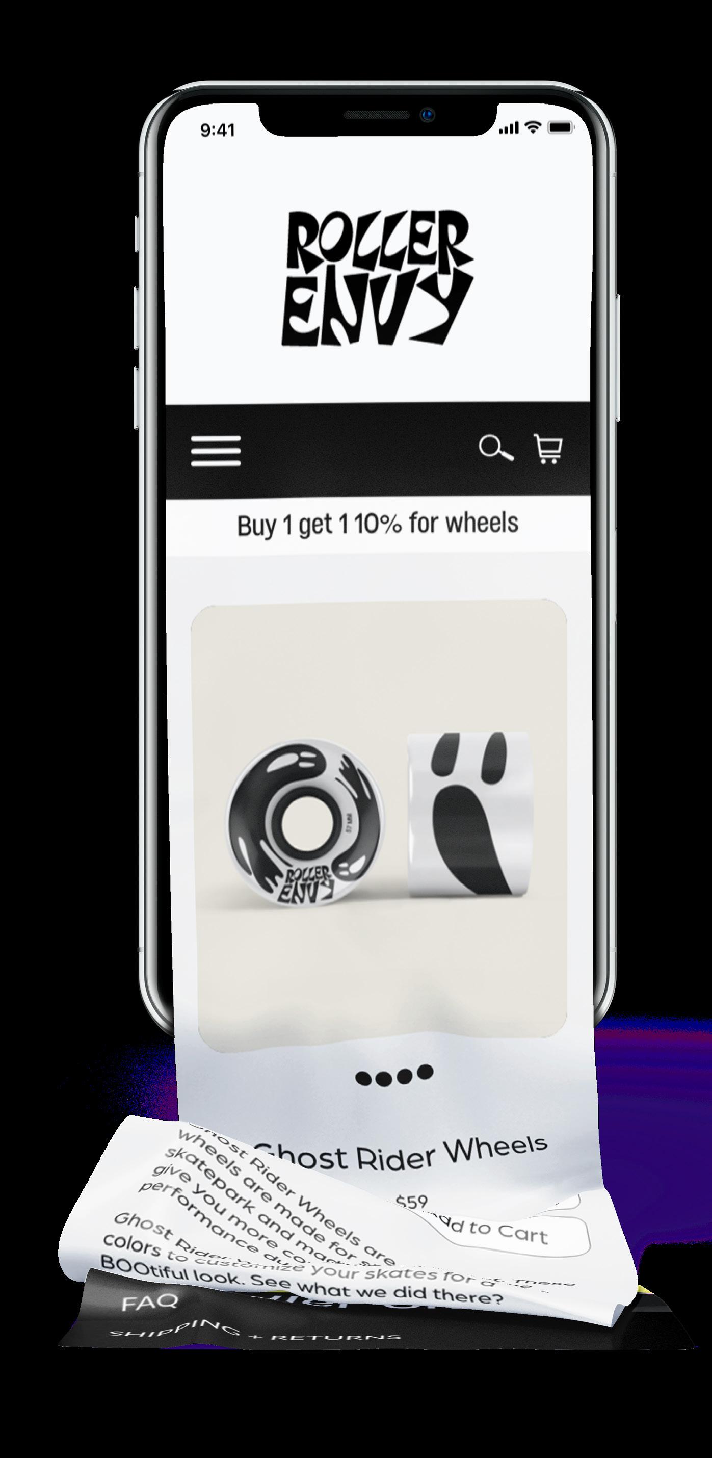 This case study includes Roller Envy’s branding package with a logo, business card, and letterhead & envelope. The extension of the brand is seen through the website application and skatepark bowl product advertisement. Other additions include Ghost Rider Wheels, which feature Roller Envy’s brand colors, and the Inkling Roller Skates line which showcases how products can vary in color and take on a life of their own.