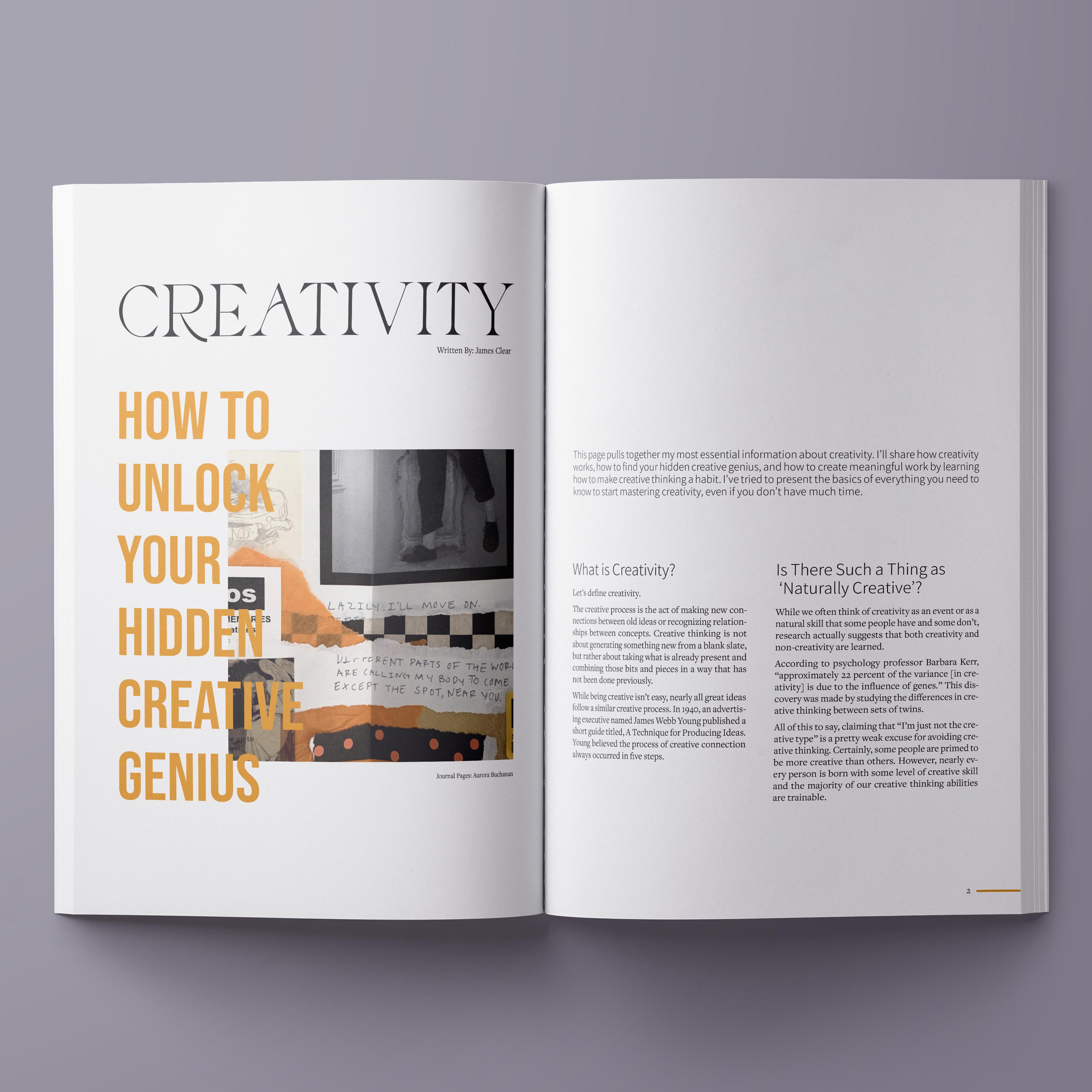 Diving into the world of editorial design, Two of a Kind features one magazine article laid out in two unique ways. The article used for this case study is “Creativity: How To Unlock Your Hidden Creative Genius”, by James Clear. Each magazine style focuses on specific design elements and a concentrated color palette.
