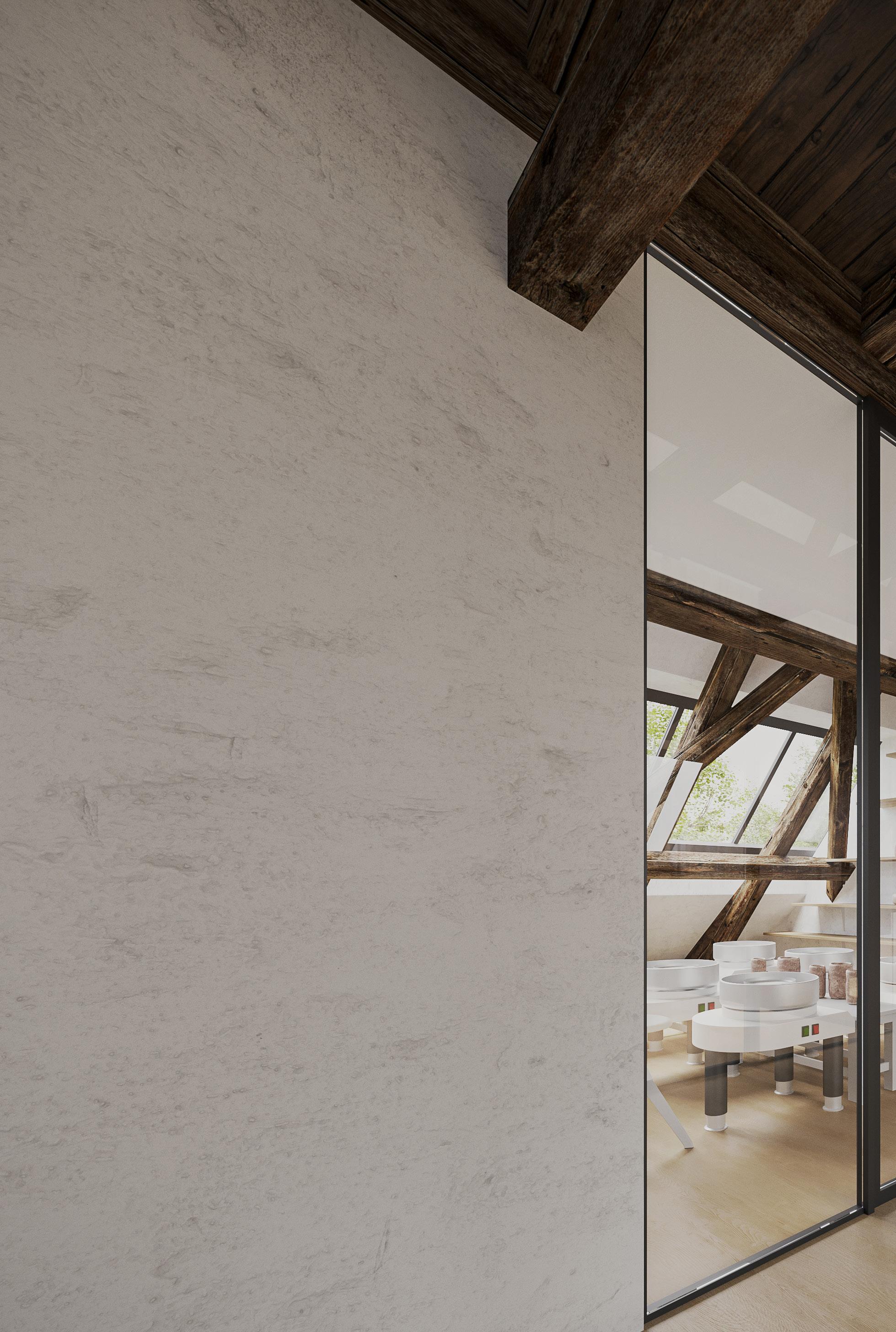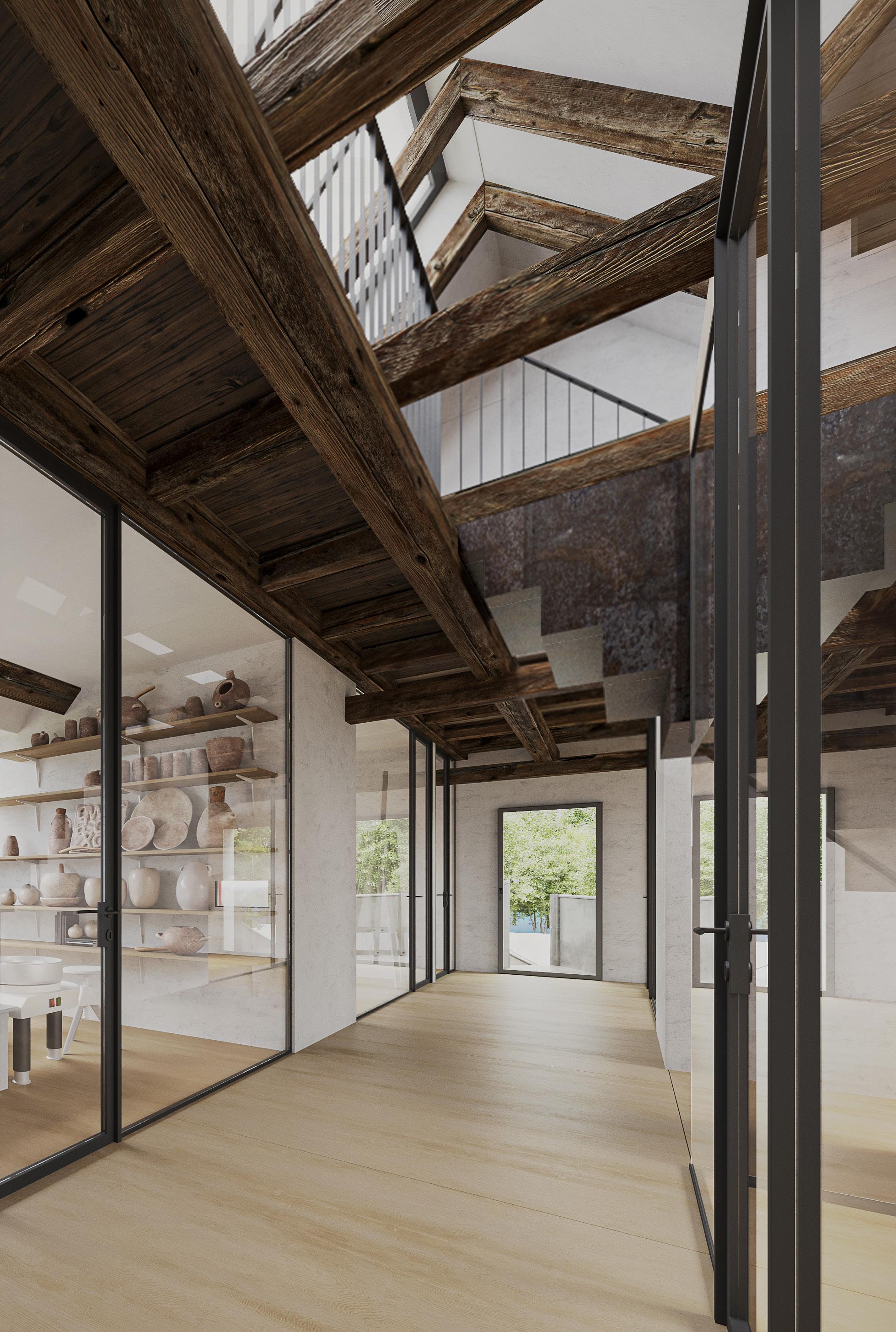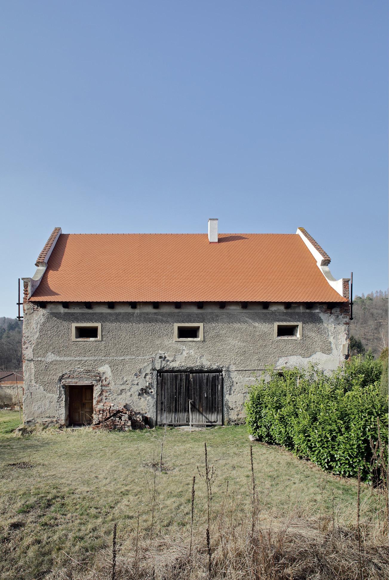 Prostor v podkroví má dvě úrovně - uživatelný prostor, který chceme prosklenými stěnami rozdělit na několik výtvarných atelierů, které lze však využít pro různé účely, a nad nimi hambálek, kde by měly vzniknout dva obyvatelné pokoje s příslušenstvím. Světlo zde vyřeší pásové okno ve střeše a ot evřený prostor mezi patry. Původní smíšené zdivo, které mapuje léta existence stavby stabilizujeme tenkou omítkou, která objekt ochrání proti povětrnosti a dešti, ale zároveň nezakryje nynější unikátní podobu vnější schránky domu. Poukazujeme tak na historicky poslední dochovanou fasádu tohoto typu na zemědělské stavbě. Myšlenky na blížící se zimní období nás pak přenesly k nápadu na vnitřní zateplení prostor v kombinaci s naopak nadkrovní izolací z vrchu. Voilà - a náhle bylo kudy vést všechny trubky rozvodů kanalizace a vody.
