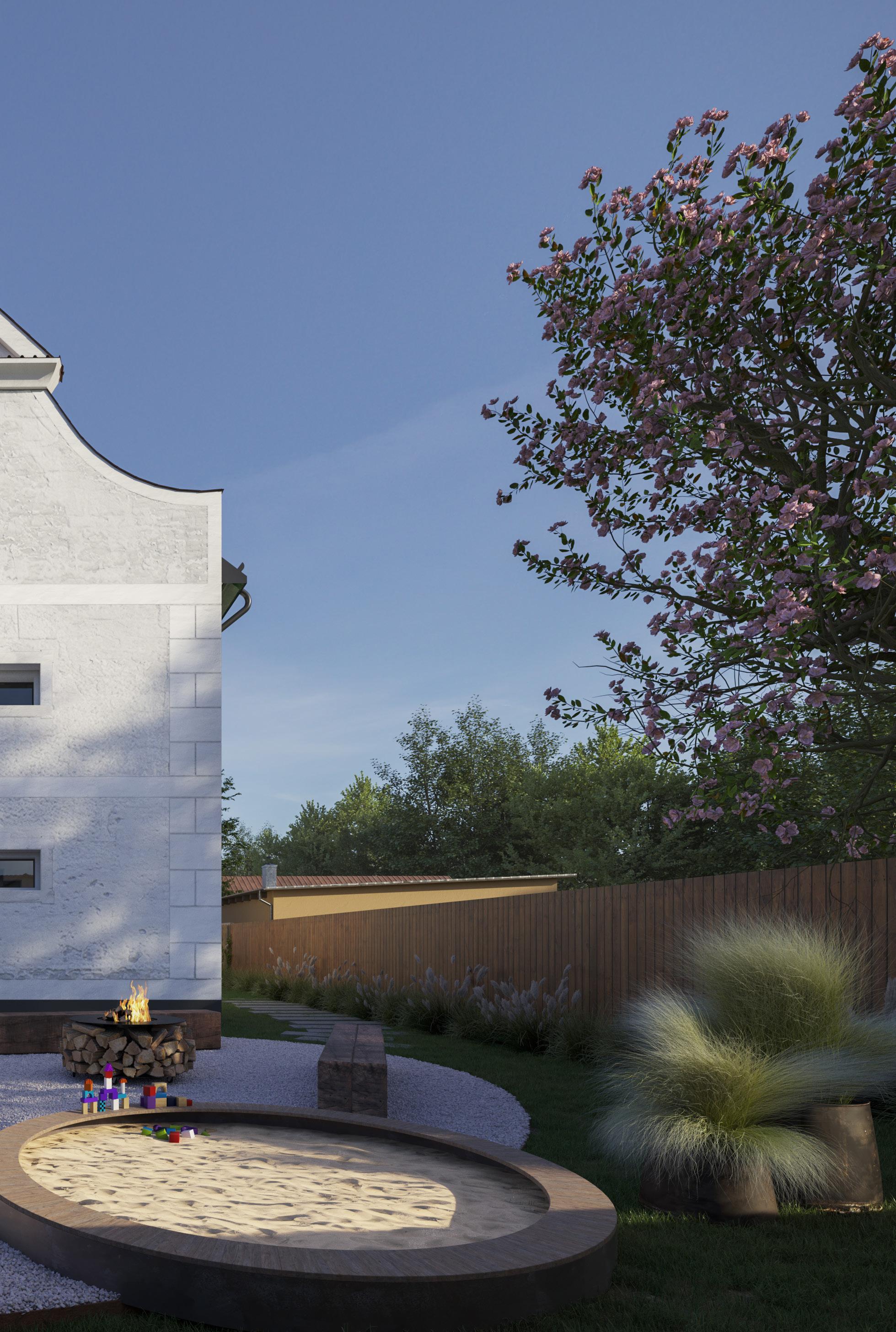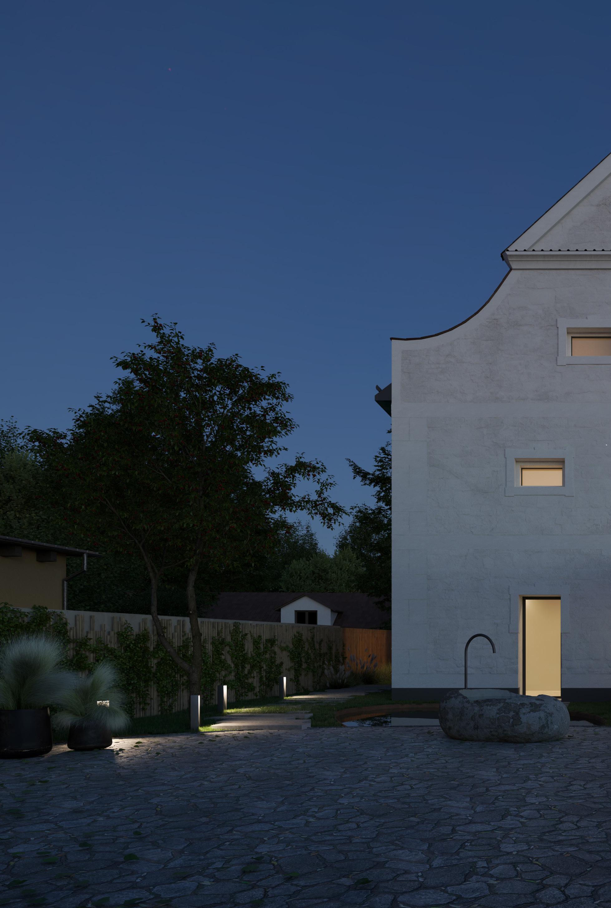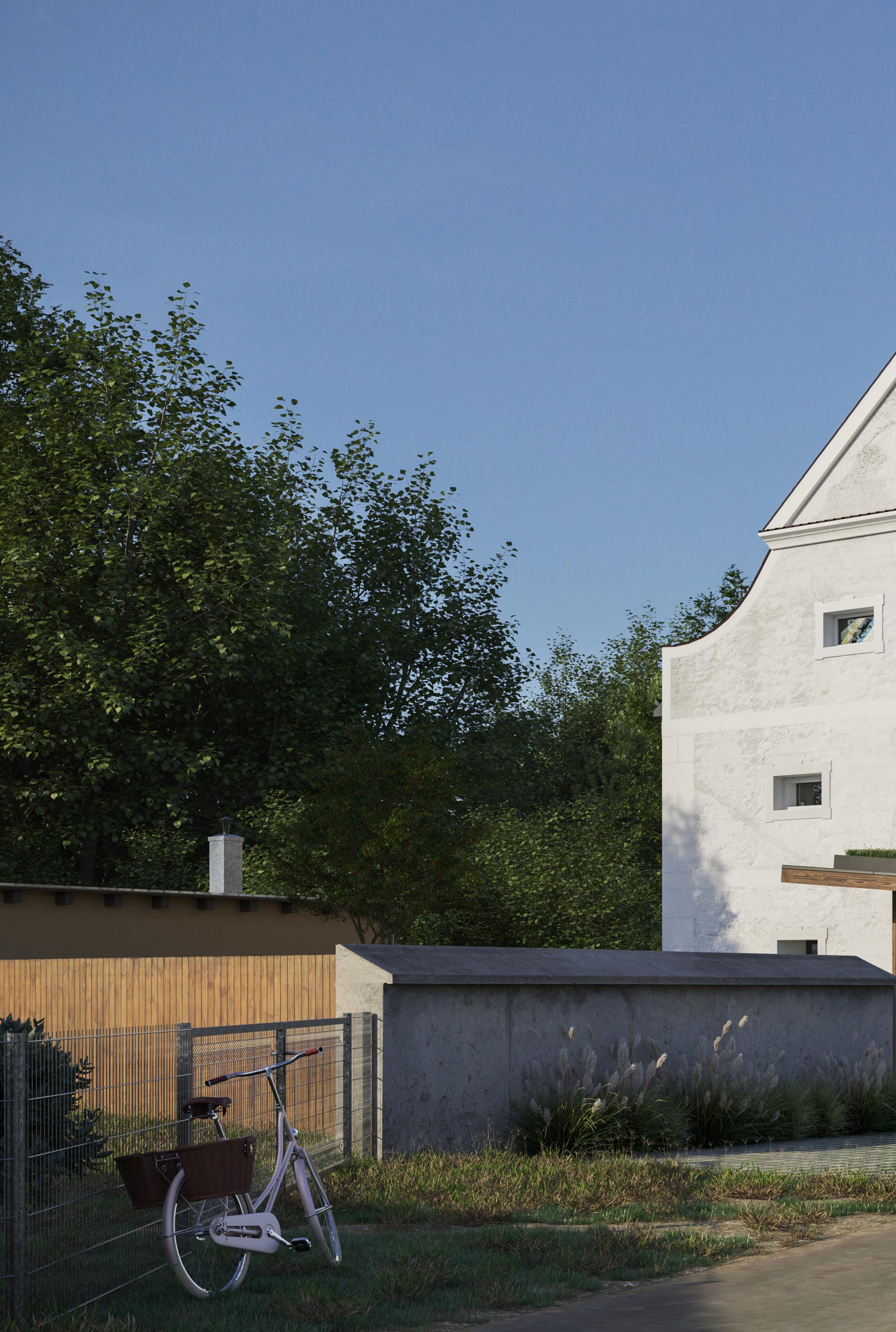 Vstup do domu, který byl v průběhu let několikrát změněn, je zamýšleno vybudovat opět ve středu východní stěny, a navrátit tak domu jeho přirozenou osovost. V zahradě na opačné straně domu bude rekreační plocha, místo pro odpočinek mezi ovocnými stromy a vysokými travinami, dřevěná terasa s posezením i malé dětské hřiště. Na této straně domu bude vznikne také vnější točité schodiště pro vstup do vyšších pater.