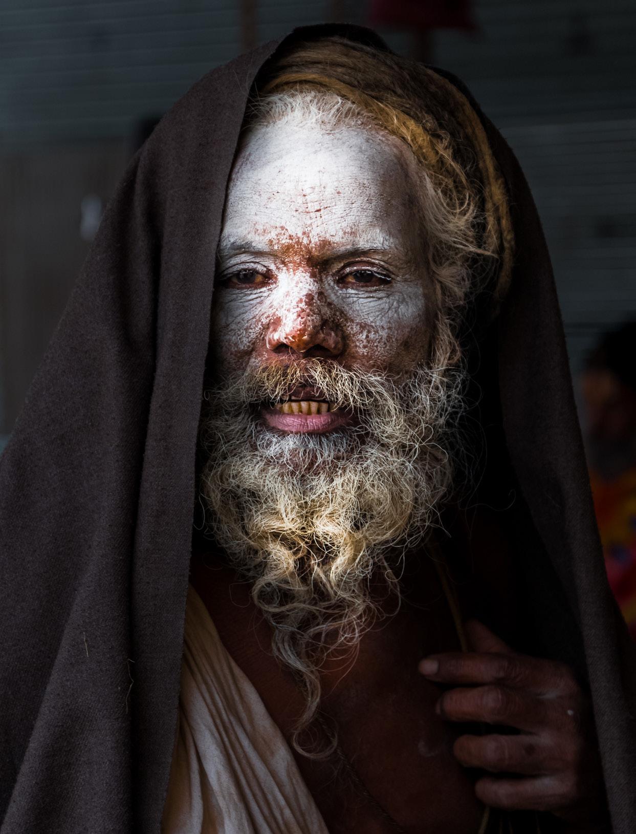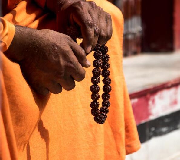 A Naga Sadhu holding rudraksha malatraditional prayer beads