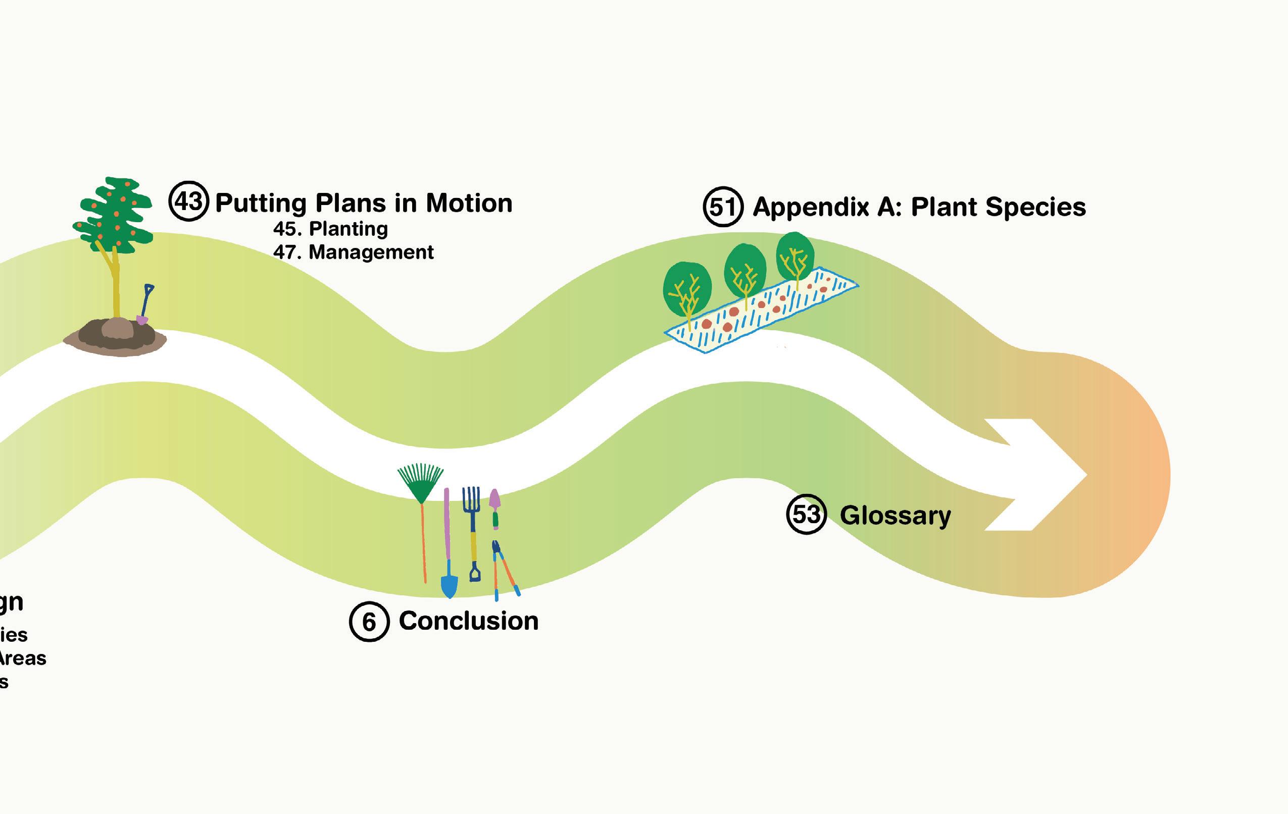 Graphics are extensively used to capture the essence of ideas, while concise descriptions efficiently explain some of the more complex topics. The shaky style of simple drawings is inspired by Nike designer Ruohan Wang, while a palette of bright colors pop off the page and keep the messages engaging. The same style is extended to more technical diagrams where trees and plants receive distinctive colors to clearly reveal patterns, and tables where colors denote plant typology and highlight information such as bloom time, height/width range, and more.