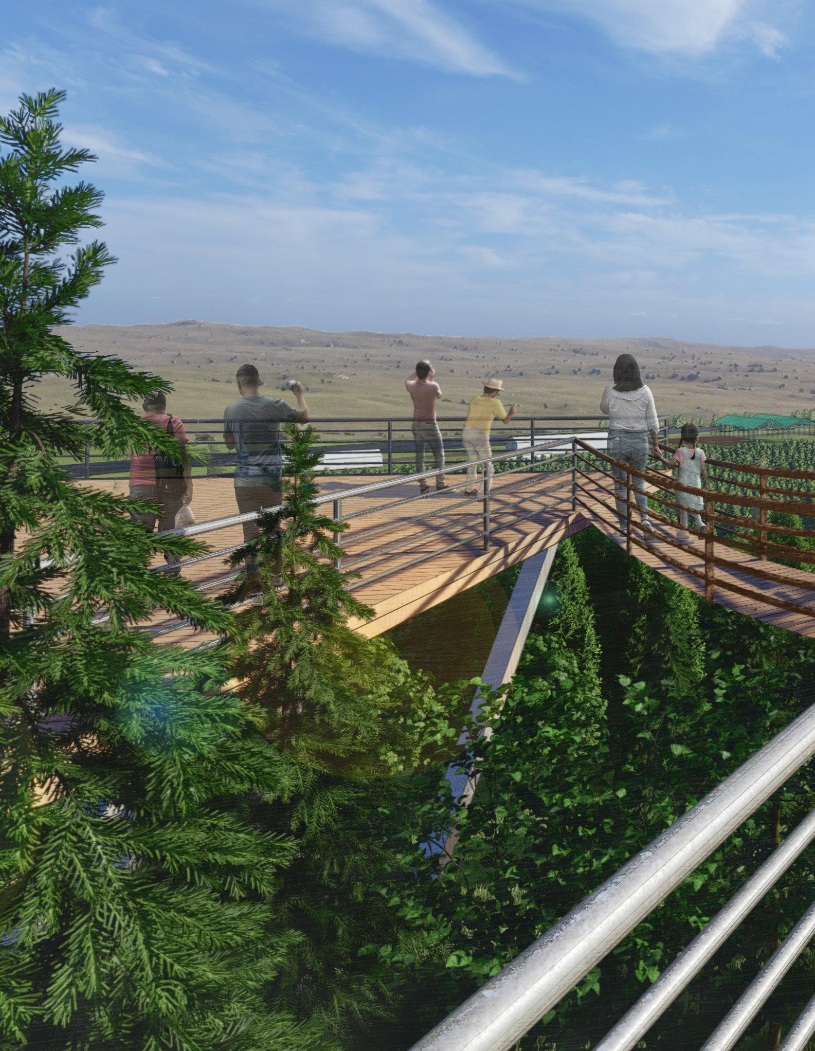 An active nursery sits embedded between a hill and the Middle Loup River, producing 2+ million trees per year in a former grassland. Our trail offers three distinct experiences including a river walk, arboretum tour, and hillside overlook of the nursery, all wrapped up in one mile of trail with an optional half mile loop through the original 1906 nursery buildings, which are on the National Register of Historic Places. The overlook has three tiers, focusing on each of the experiences, and allows hikers an unobstructed view of the nursery, river, and natural Sandhills landscape beyond.