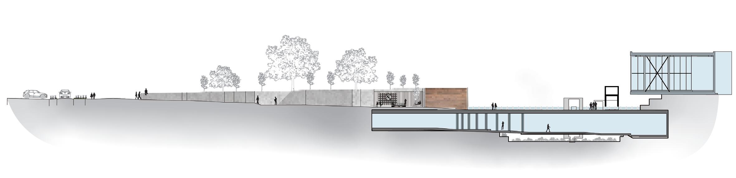 As the terraces wind down and the silo rises up, a new platform focuses attention on the concrete shell’s discolored exterior. Our vision for this exposed boundary includes projections for interacting with historical moments and paths for first-hand exploration. A museum building cuts across the open excavation, affording visitors the liberty to make their own experience through the Launch Control Center and repurposed silo. An education wing is tucked under a green roof, while the ice drilling research wing covers the silo opening.