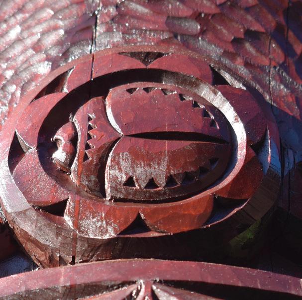 The main surface pattern on the ūpoko and kaitaka border is the ‘ritorito’ pattern from the Taranaki carving tradition representing the flax family. This border pattern is based on the work of John H. Menzies, an ancestor of the carverand represents ‘ngā tuna o te awa o Motueka’. and represents ‘ngā tuna o te awa o Motueka’.