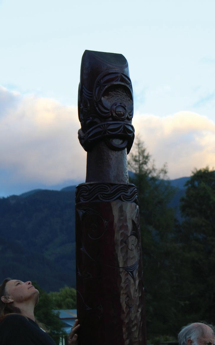 The top is the head of a Ngāti Tama tupuna carved in the same way as the head at the top of a tokotoko with the conical peak representing Taranaki mounga.