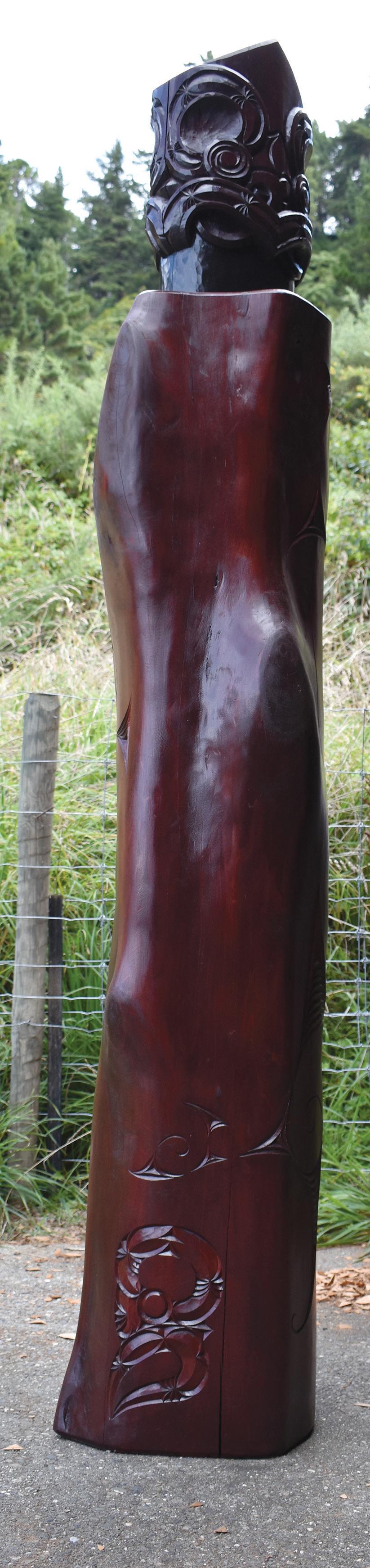 The body of the pou is made of old Macrocarpa (Monterey Cypress) wood, and the head is made of tōtara..