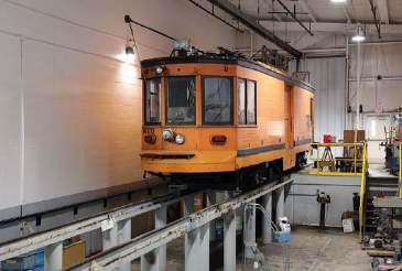 3. One of the most valuable works cars at the PTM is M210, a PRC product built in its Homewood Shops in 1940. It is seen here in the museum’s sunken workshop. Its primary use is as an overhead line car and it features a tower platform that swivels and can be hydraulically raised and lowered. 4 July 2023.
