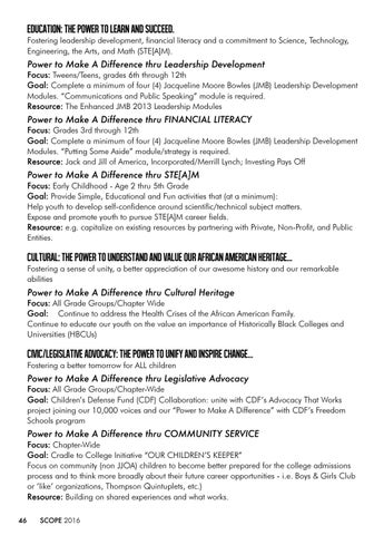 Focus: All Grade Groups/Chapter-Wide Goal: Children’s Defense Fund (CDF) Collaboration: unite with CDF’s Advocacy That Works project joining our 10,000 voices and our “Power to Make A Difference” with CDF’s Freedom Schools program