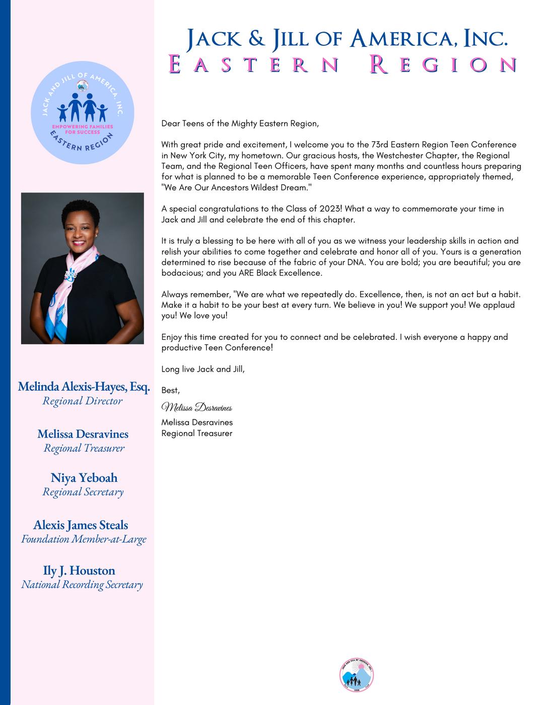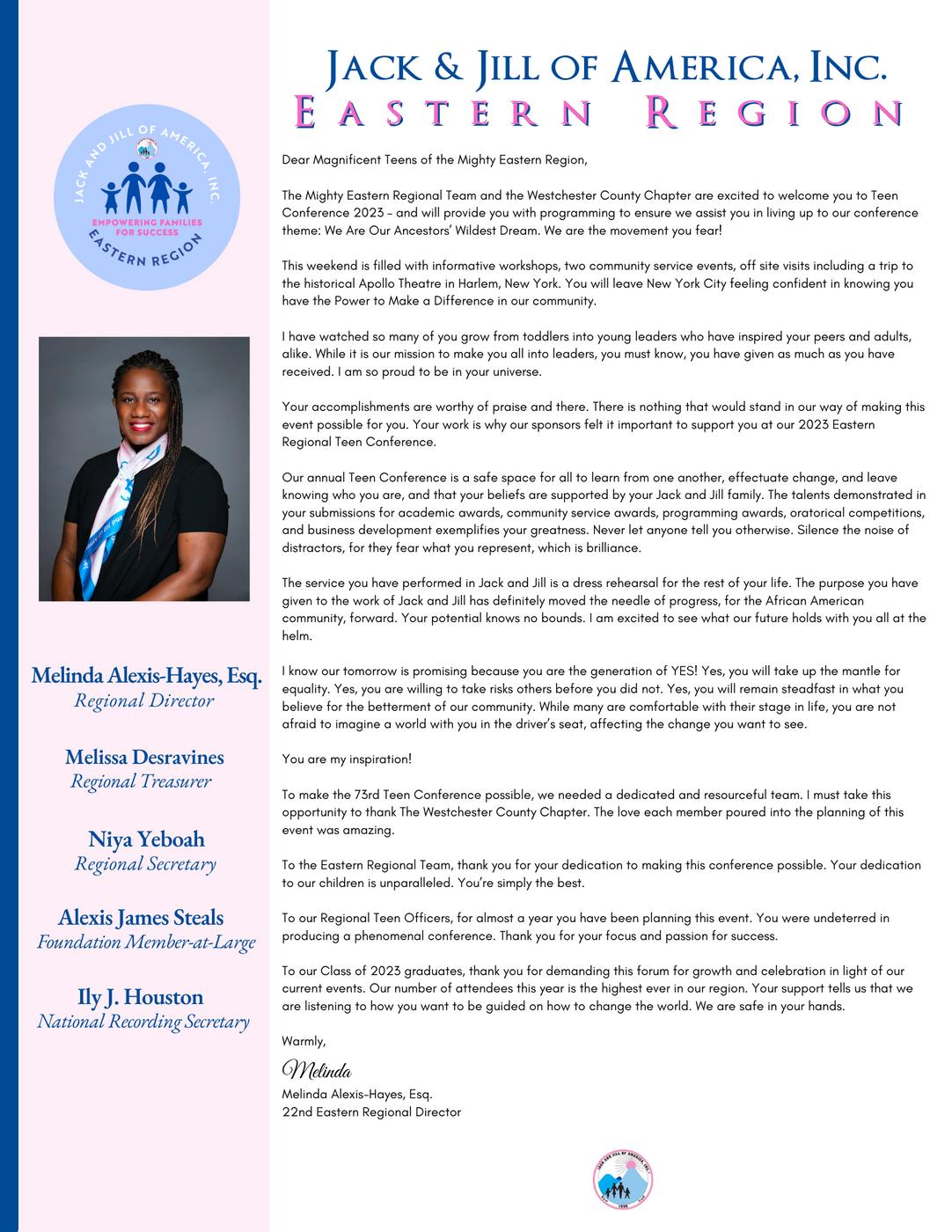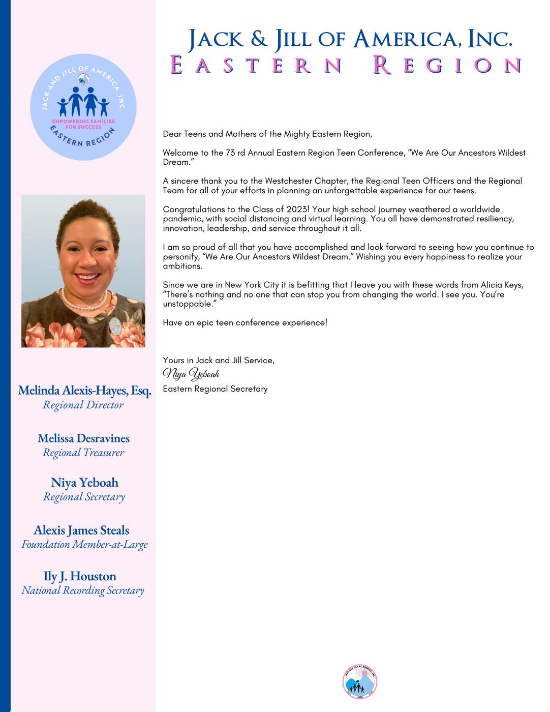 JACK AND JILL OF AMERICA, INC. 73RD ANNUAL EASTERN REGION TEEN CONFERENCE March 16- March 19, 2023, Sheraton Times Square NY, NY Hosted by the Westchester County 2 0 2 3 T E E N C O N F E R E N C E G U I D E E a s t e r n R e g i o n a l D i r e c t o r M e l i n d a A l e x isH a y e s E a s t e r n R e g i o n a l T e e n P r e s i d e n t A d d is o n R o s e A r t C o n t e s t W i n n e r : F . K a i J o n e s 9 t h G r a d e , W a s h i n g t o n , D C C h a p t e r
