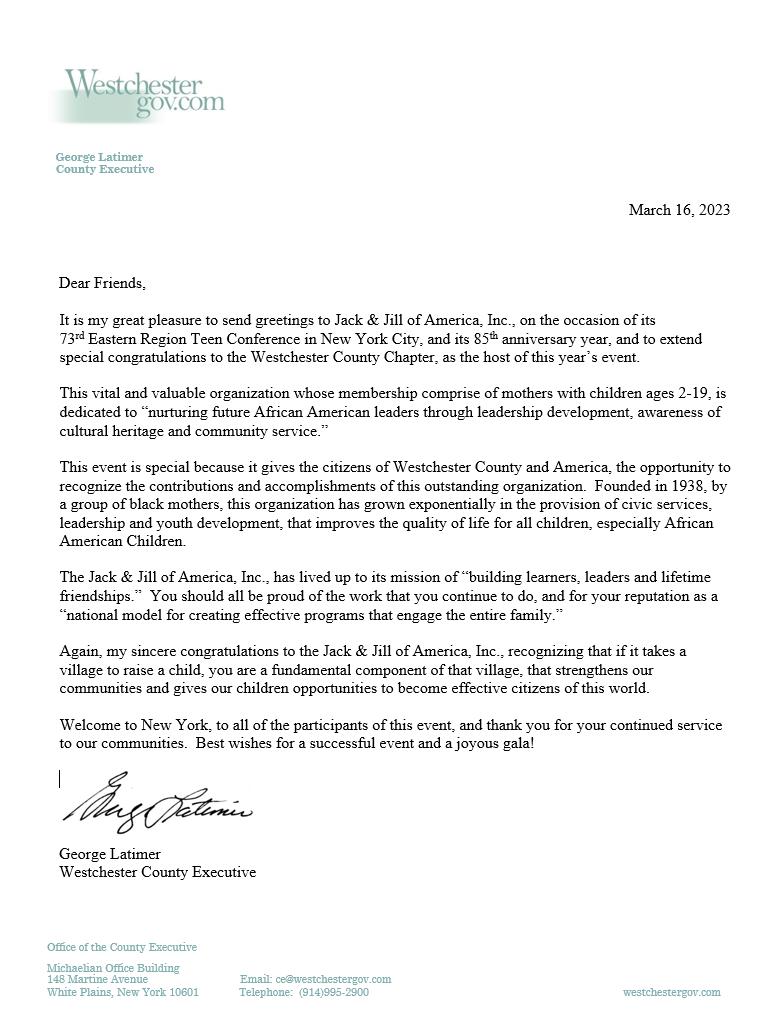 It gives me great pleasure to welcome everyone to the Westchester County Chapter of Jack and Jill of America, Inc. (JJOA)’s 73rd annual eastern region teen conference. New York’s strength comes from the generations of individuals who have made our city their home and chosen to share their wealth of knowledge and talents with those who live throughout the five boroughs Over time, their contributions have transformed into a powerful legacy that has helped alleviate the burdens of raising a family and established an exciting place for our youth to explore. One organization that has propelled New York along this path is the Westchester County Chapter of JJOA. Established in 1954, the chapter has organized hundreds of enrichment events and increased educational programming in the area. By encouraging our youth to explore the arts, join in recreational activities, and learn about historic Black leaders, this group has nurtured the minds, bodies, and spirits of the next generation. The ties made here have the potential to positively transform our city and state as each of its members comes together to build a more informed and active community. On the occasion of tonight’s conference, I am pleased to recognize the Westchester County Chapter of JJOA for its efforts to embolden our youth and inspire New York’s future changemakers.