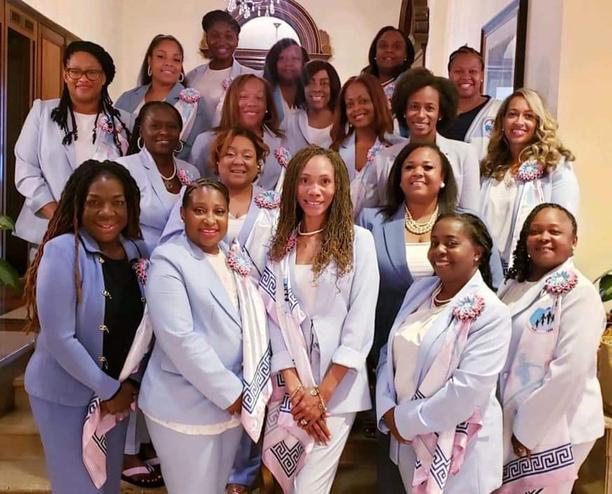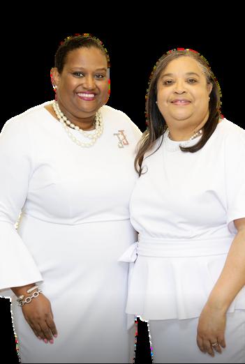 (bottom,lefttoright)Editor,UrsulaReynolds;Corresponding Secretary,TeraPeterson;LeadProgramDirector,PorscheWilliams; VicePresident,GenoraHall; President,KellyJohnson;Treasurer, TracyJimerson;RecordingSecretary,SonyaWindham-Wilder; and FinancialSecretary,DaynaR.Jones.
