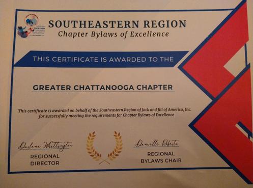 Parliamentarian Tanya Tarver’s hard work updating our chapter bylaws did not go unnoticed. Our Chapter was awarded a Southeastern Region Chapter Bylaws of Excellence certificate.