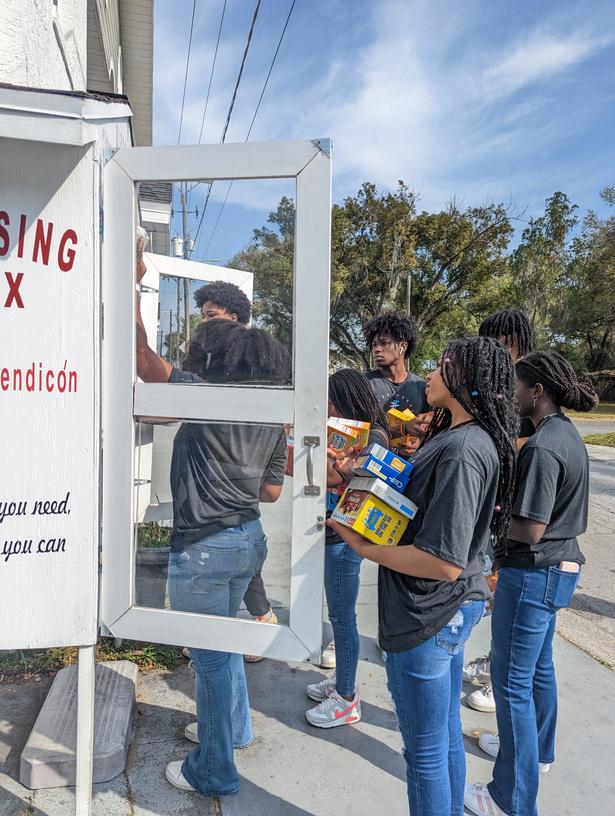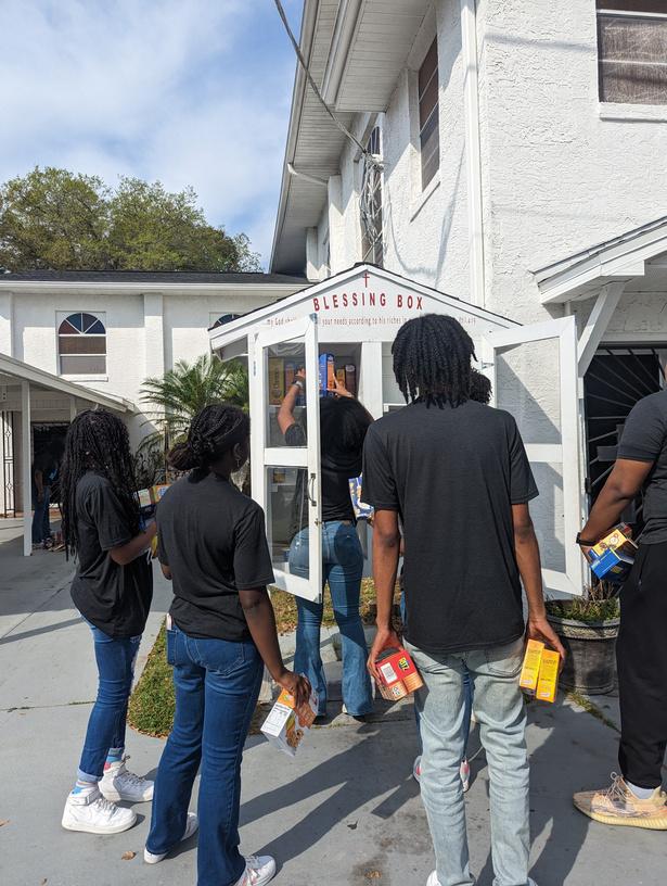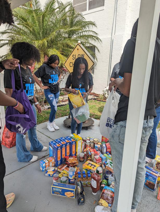 TheTrailblazersidentifiedafoodpantryknownas the“BlessingsBox,”atSt.JohnMissionaryBaptist ChurchinDadeCity.Ourteensorganizedafood drivebyconnectingwithfriends,local neighborhoods,andourgradegroups.On February25th,theTrailblazersgatheredall collecteddonations,sorted,andthenfilledthe BlessingsBox!