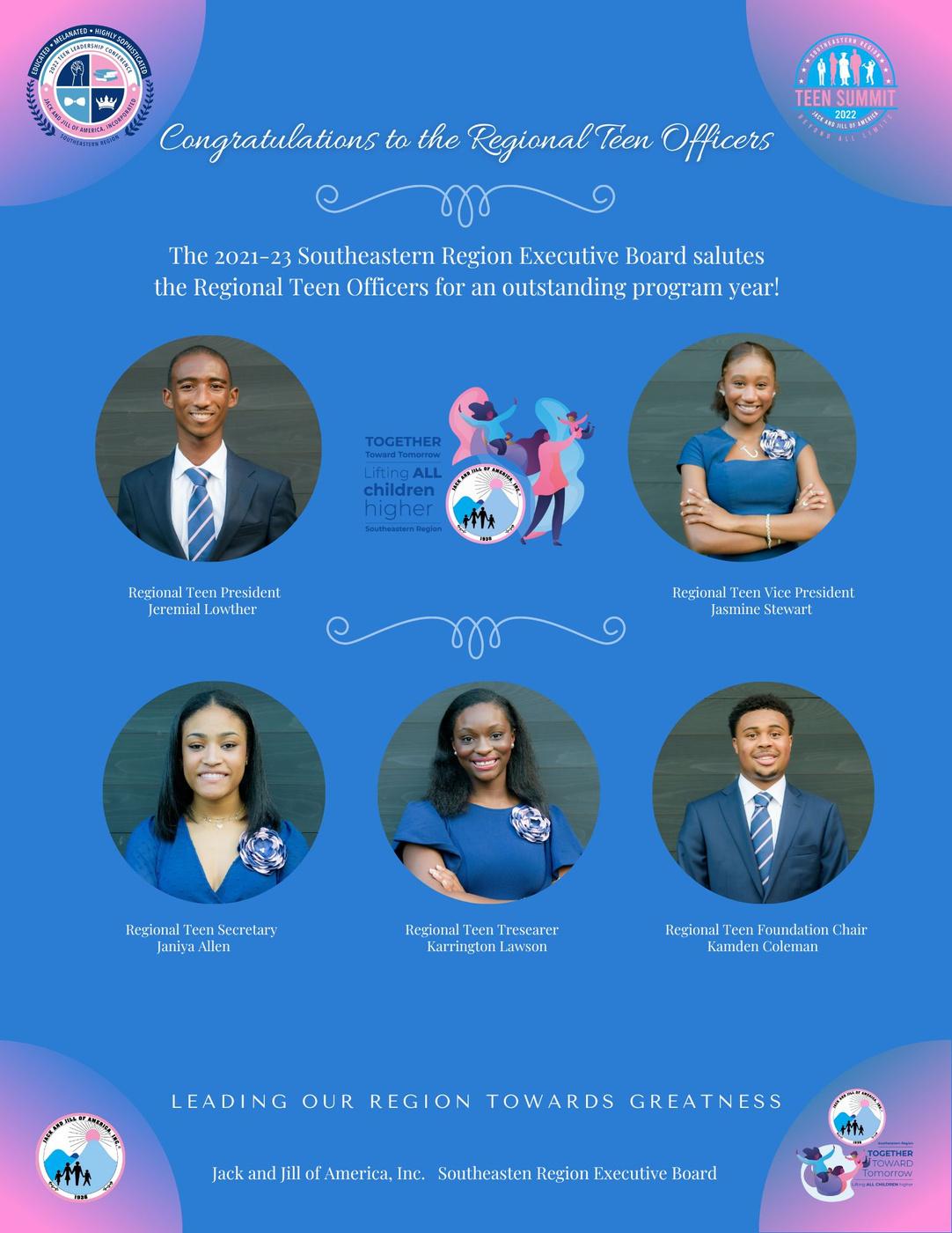 Five of our six teen graduates were present at the region’s first post Covid teen leadership conference. Moving toward their next academic endeavor, our teen graduates passed the torch, and are now preparing for their journey as college freshmen Southeastern Regional Director Darlene McGhee Whittington congratulated our graduate Teen President Kole A. Fortson on receiving the inaugural Leaving A Legacy Award. This new award was presented to the chapter teen president in the region who exemplified leadership qualities within Jack and Jill, and in the community. Our graduate Teen Vice President Madison McCoy, and Dunwoody Chapter Teen Vice President Olivia Tolliver, were presented another inaugural award, the VIP VP Award This honor was presented to buddy chapters that completed three joint activities together for the program year.