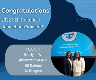 June 16, 2022, the Super Cluster state level teen winners advanced to the regional competition during the 65th Teen Leadership Conference (TLC). L R: Symone Thompson (Tallahassee, FL); Mikayla Prude (Nashville, TN); 1st Place Regional Winner Braelynn White (Fayette County, GA); & Caitlyn Copeland (Birmingham, AL). Thank you to all moms who led the local & state competitions that prepared our orators for the Regional Competition including Regional Program Chair Selika Sampson, Co Chair Tammy Means, & SER Oratorical Chair Adria Welcher.