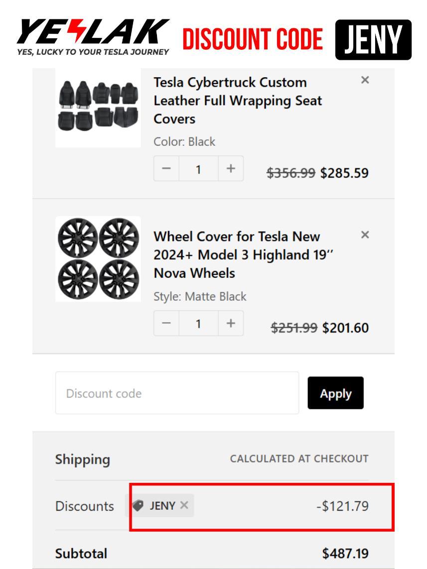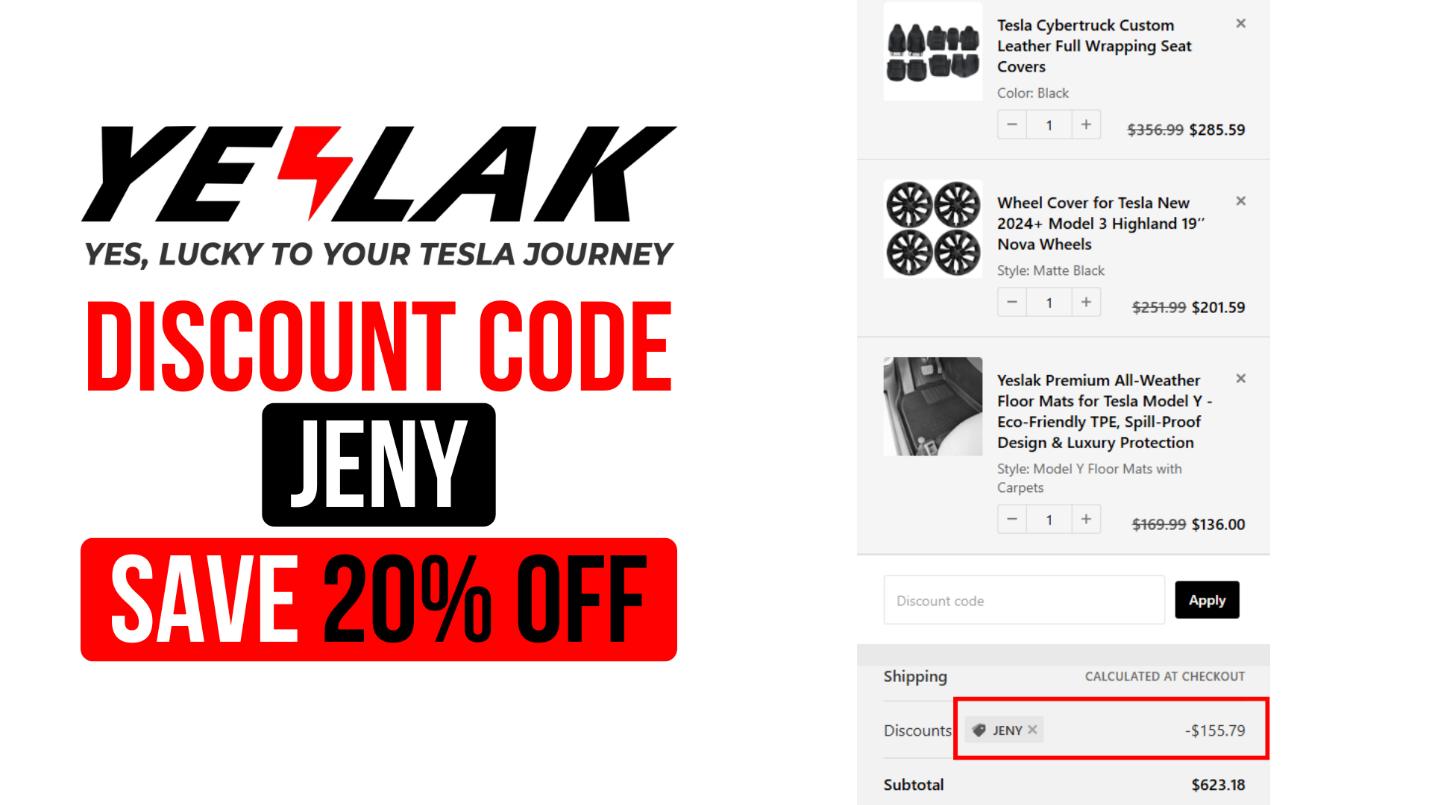 Quick Tip: Use the Yeslak Discount Code JENY to instantly Save 20% OFF any order when shopping through yeslak.com and unlock premium Tesla upgrades for less.