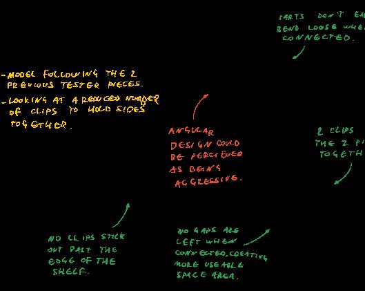 This was chosen as the manufacture method as the cost had to be kept as low as possible. The shelves had to be designed out of different parts which clicked together, this led to careful consideration towards the technical aspects of the design.
