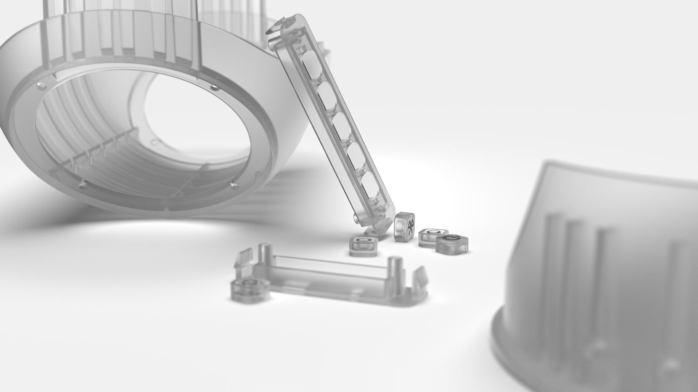 In order to achieve the form of the initial design, as well as securely housing the internal components, the top and bottom sections are designed to be injection moulded.