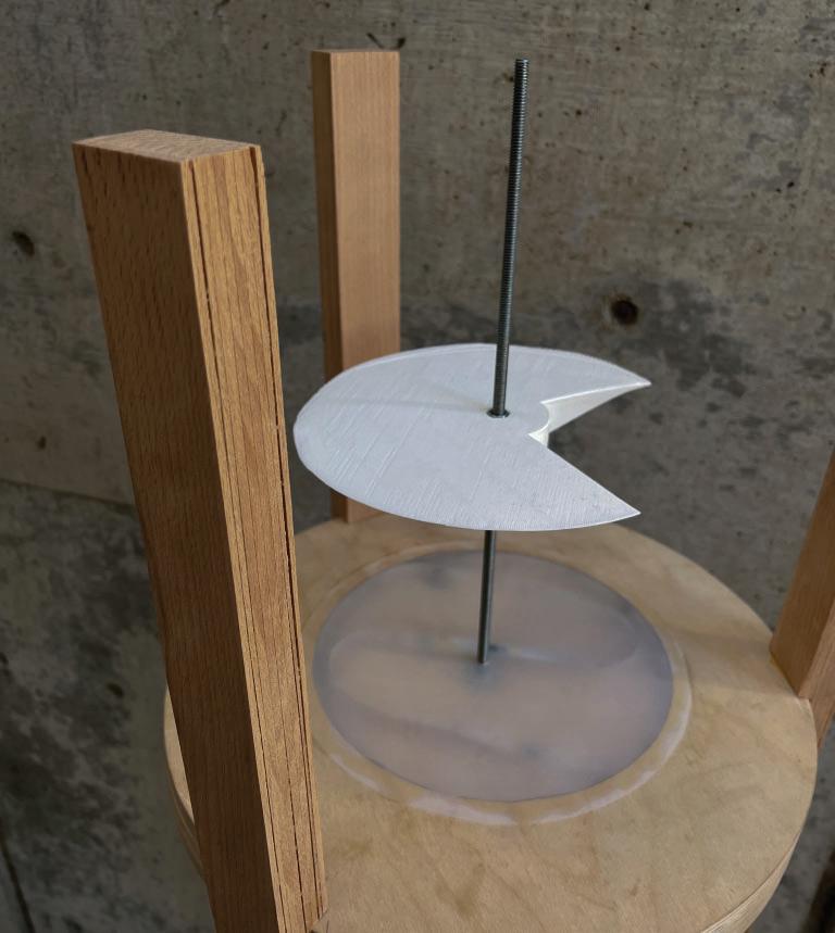 Floor Lamp: Based on the filipino toy Sipa Tingga, this floor lamp captures the up and down movement of the game. The legs of the lamp were created by bending 1/8” strips of wood and gluing them together. The platform that holds the light is a shell of plywood capped by lamp shade film. Threading is shot through the platform with 3D-printed conical disk attached. Similar to the game, the disk spins up and down along the threading, diffusing the light and changing the atmosphere of the room. This piece of was entered in the 2024 Vellum Furniture Design Competition.