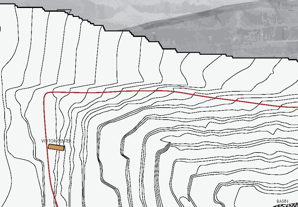 Masterplan: The hiking trail begins at the existing road and hits five focal points. These specific areas are marked due to their unique landforms or resemblence to iconic national park views. The trail itself is about 2.5 miles long and traverses many different grades. The entry tunnel and visitor center found at the highest point lie on the same axis to create a piece of land art that serves as a waypoint to inhabitants.