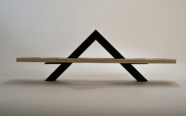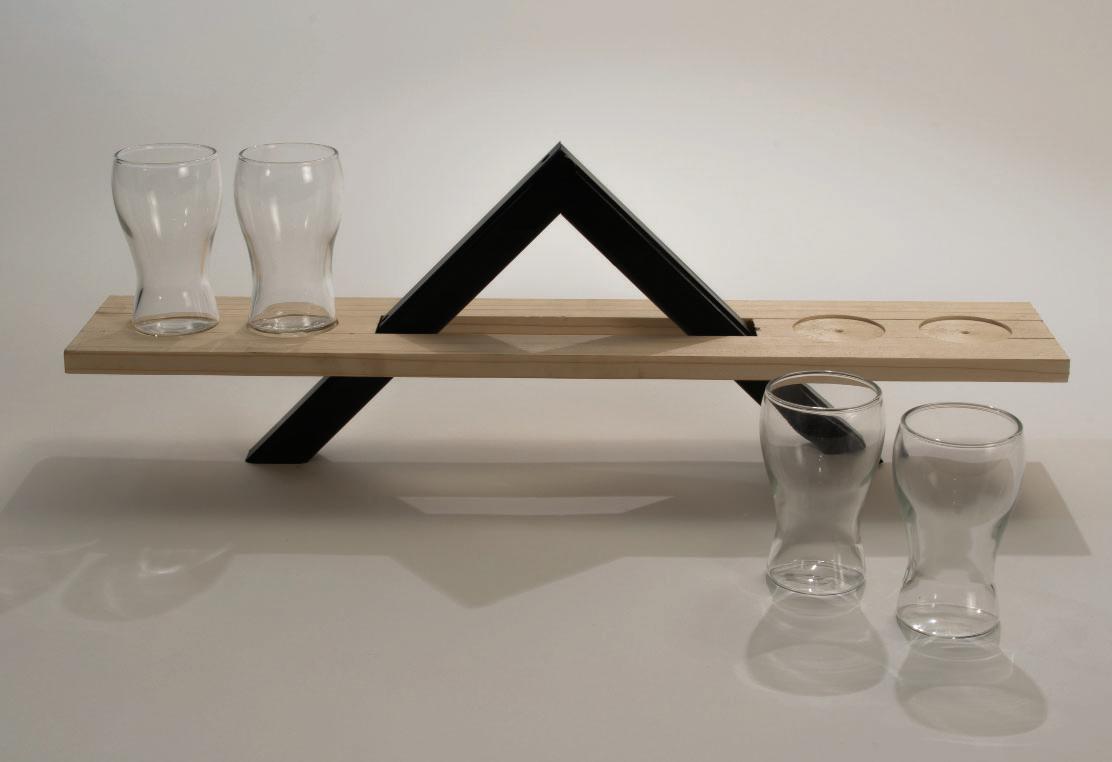 Flight Carrier: Designed for Top Bins Brewery, the handle and spine of this flight carrier was created by welding steel at a 90 degree angle. Meant to mimic the top corner of a soccer goal (also known as top bins), this flight carrier fits onto the arm of the chair that was designed at the same time.