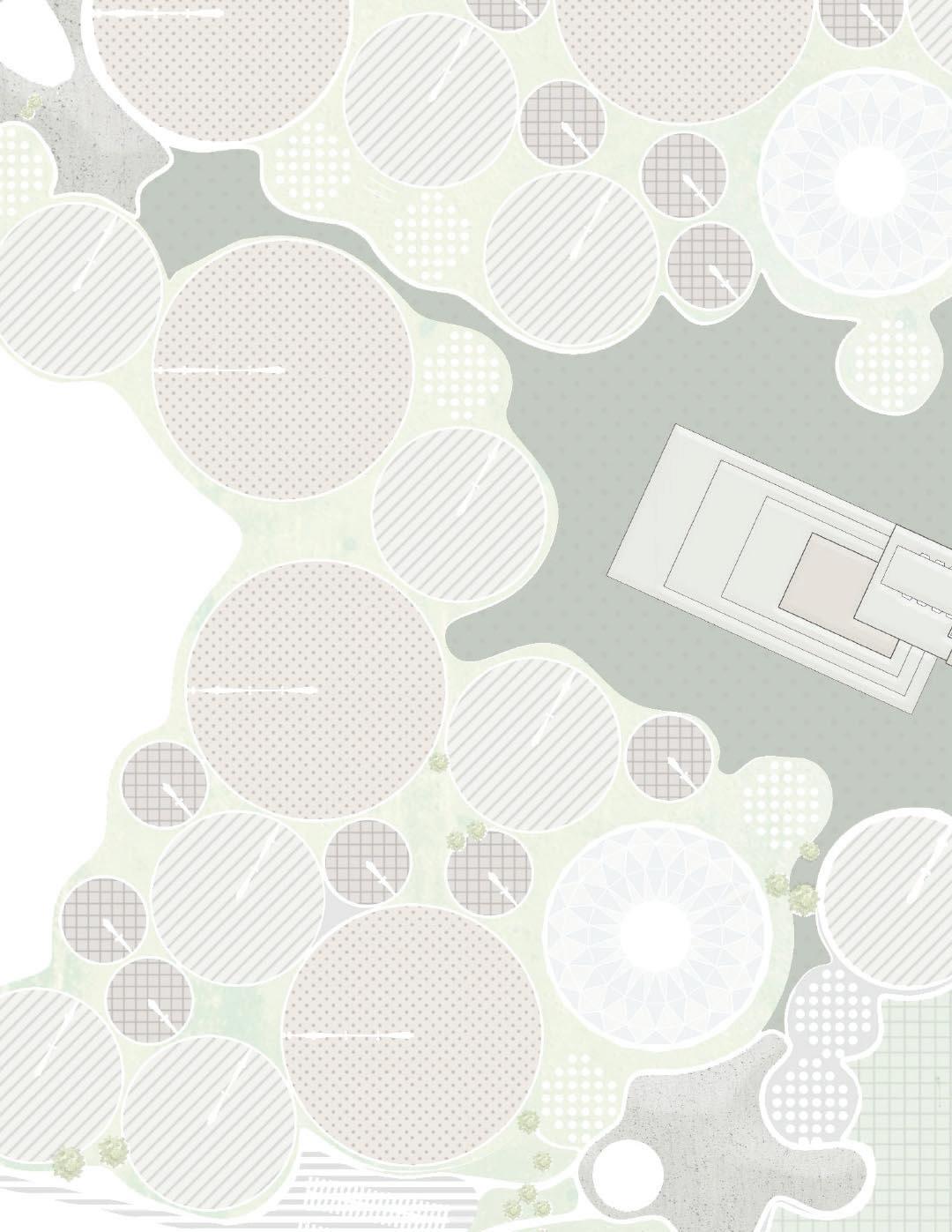 In-Between Spaces: Created as a by-product of the circular agricultural plots, these “dead” areas are uniquely formed in the negative spaces. Green Utopia takes advantage of these areas by returning them to the public as gathering spaces and circulation paths. These in-between spaces mitigate the boundary between private agricultural land and the public realm.
