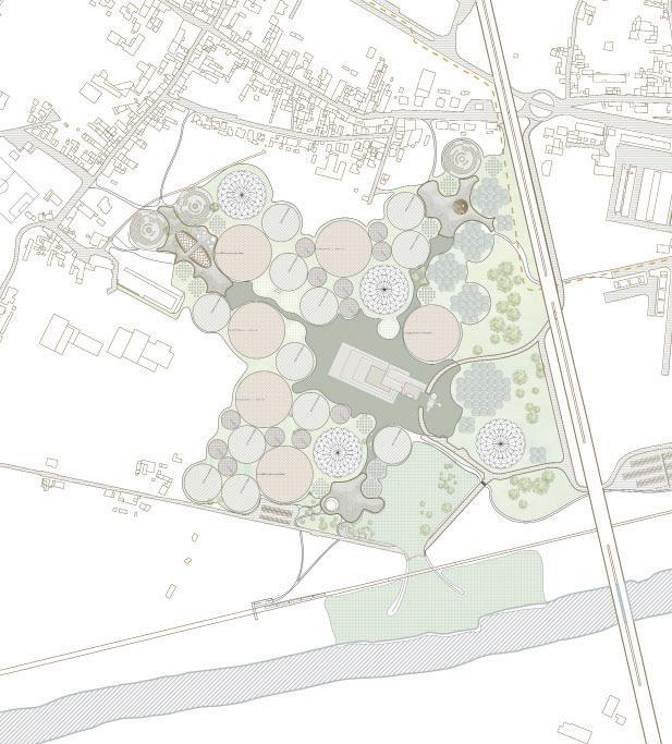 Circular Forms: The circular areas on our site are agricultural plots. Their shape is derived from centerpivot irrigation, a practice known for being one of the most efficient large-scale agricultural watering techniques. Green Utopia utilizes it to conserve water and reduce soil tilling, encouraging decomposition and minimizing soil compaction.