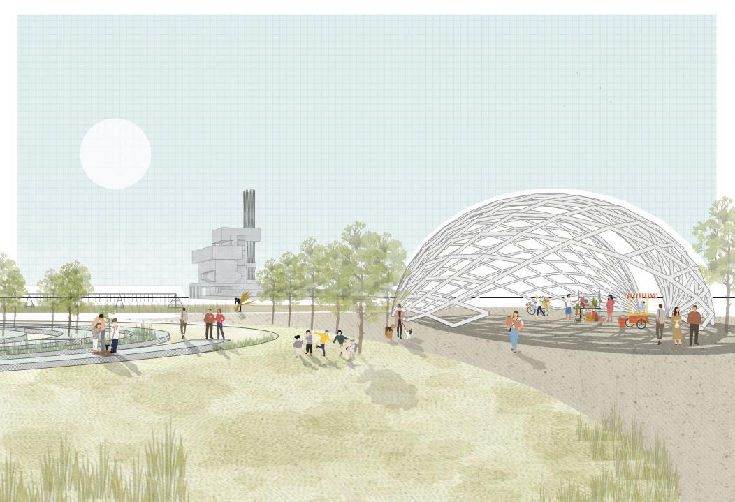 Market Place: One of three nodes in Green Utopia, the market place is found on the western entrance to the site. Bordering the San Donnino community, this pavilion supports local vendors to buy and sell goods while also easing the scale of the site as they approach the monumental incinerator.