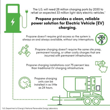 Another way propane is used as an “electric” source is in the EV charging industry (page 18). Propane can either be used in a mobile power generation situation (i.e. an EV powered vehicle has run out of juice and needs a “jump”) or in remote areas, like wildfire-prone locations in California.
