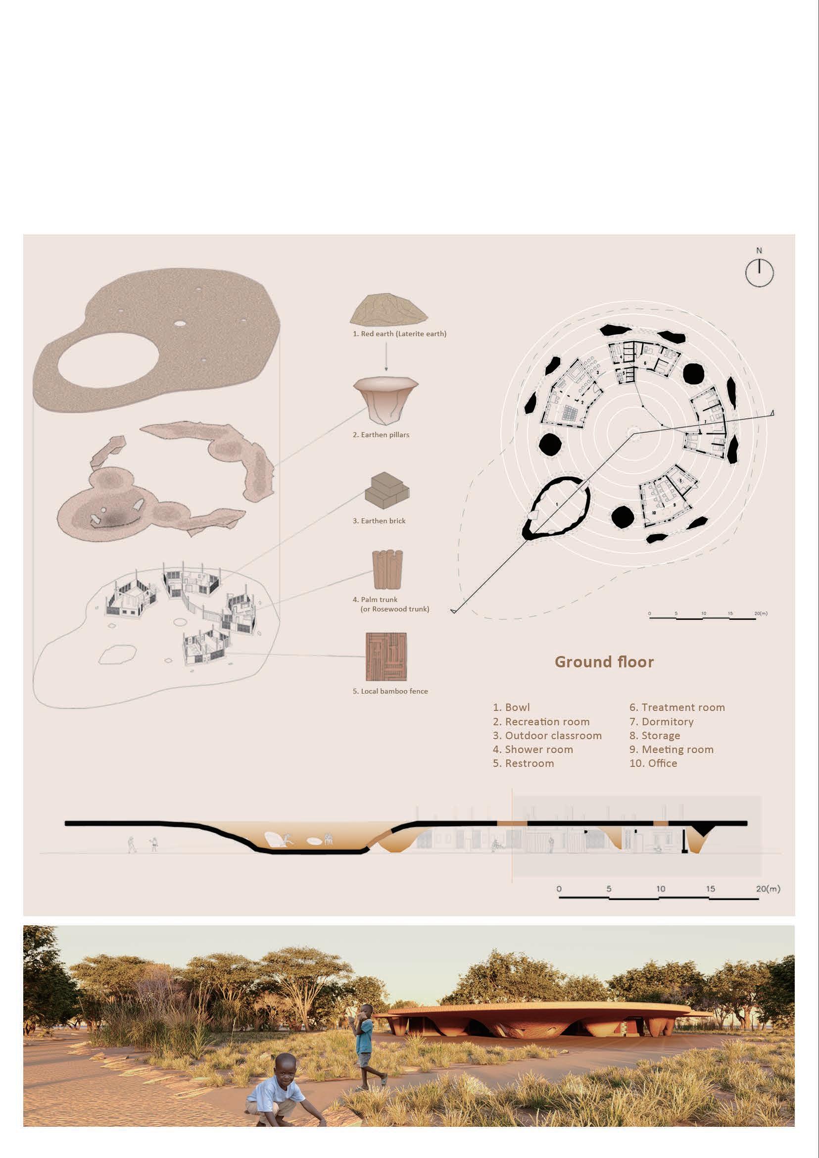 Nous avons essayé de créer une harmonie entre l'environnement du village et l'école des enfants, en utilisant la terre, le bois et les textiles de Baghere. Premièrement, le sol local est utilisé dans la construction de la large canopée, qui rend hommage au paysage local. Cette canopée est soutenue par des colonnes de terre et est parallèle aux terres environnantes, partageant le même horizon. Les poteaux de bois sont comme des arbres placés sur la canopée de l'horizon. Ils encadrent la canopée et le support interne à la construction du programme. Des briques fabriquées à partir de terre locale excavée pendant le processus de construction sont utilisées avec des clôtures en tiges tissées comme matériaux pour la façade du programme intérieur.