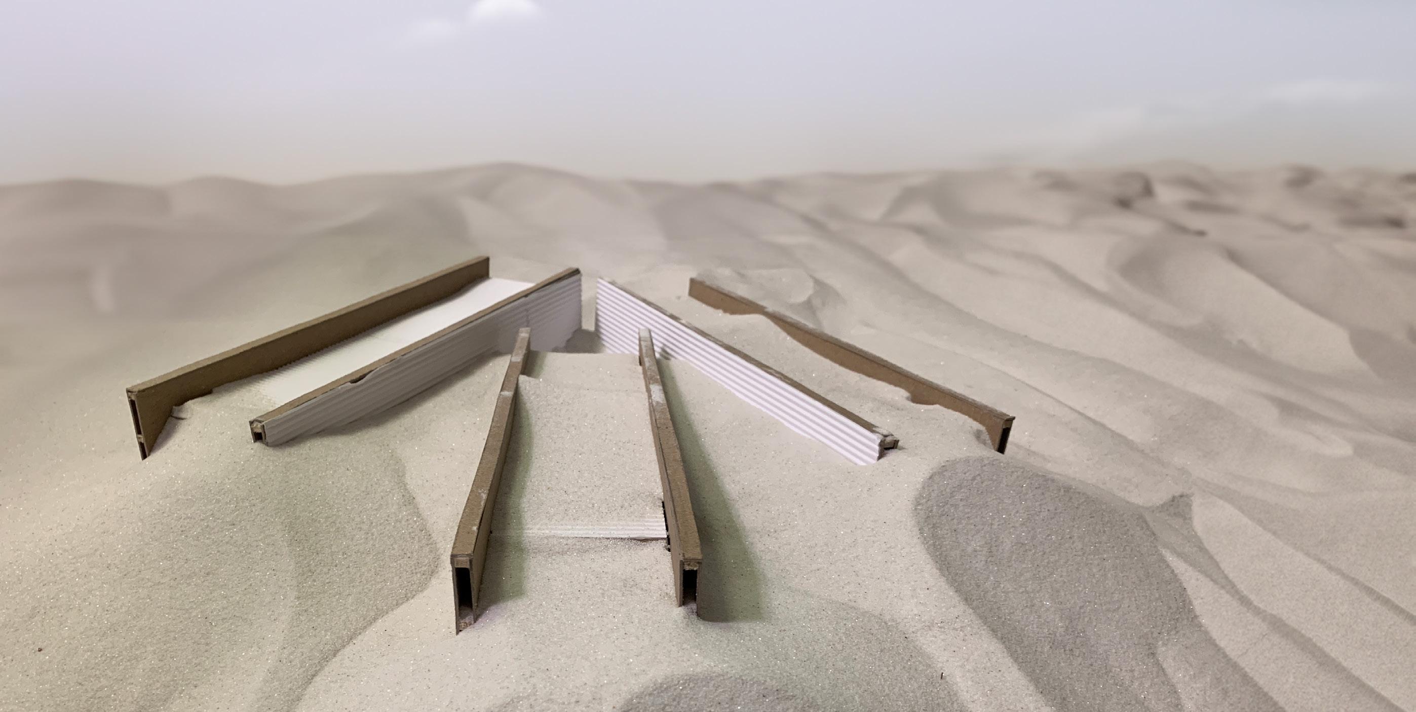 This project required myself and my design group to create a scientific research station located in death valley which will study the effects of climate change in hotspots over time. The notorious extreme weather conditions were the primary challenge to overcome. In depth research about the landscape and weather patterns gave us insight as to how we could adapt our design to the extreme climate. Our research facility uses locally sourced sustainable materials such as bags of sand and adobe, and the building itself creates its own dunes to insulate the building. The idea is that over time, wind will push the sands in death valley to create an insulative duning effect to keep the users safe.