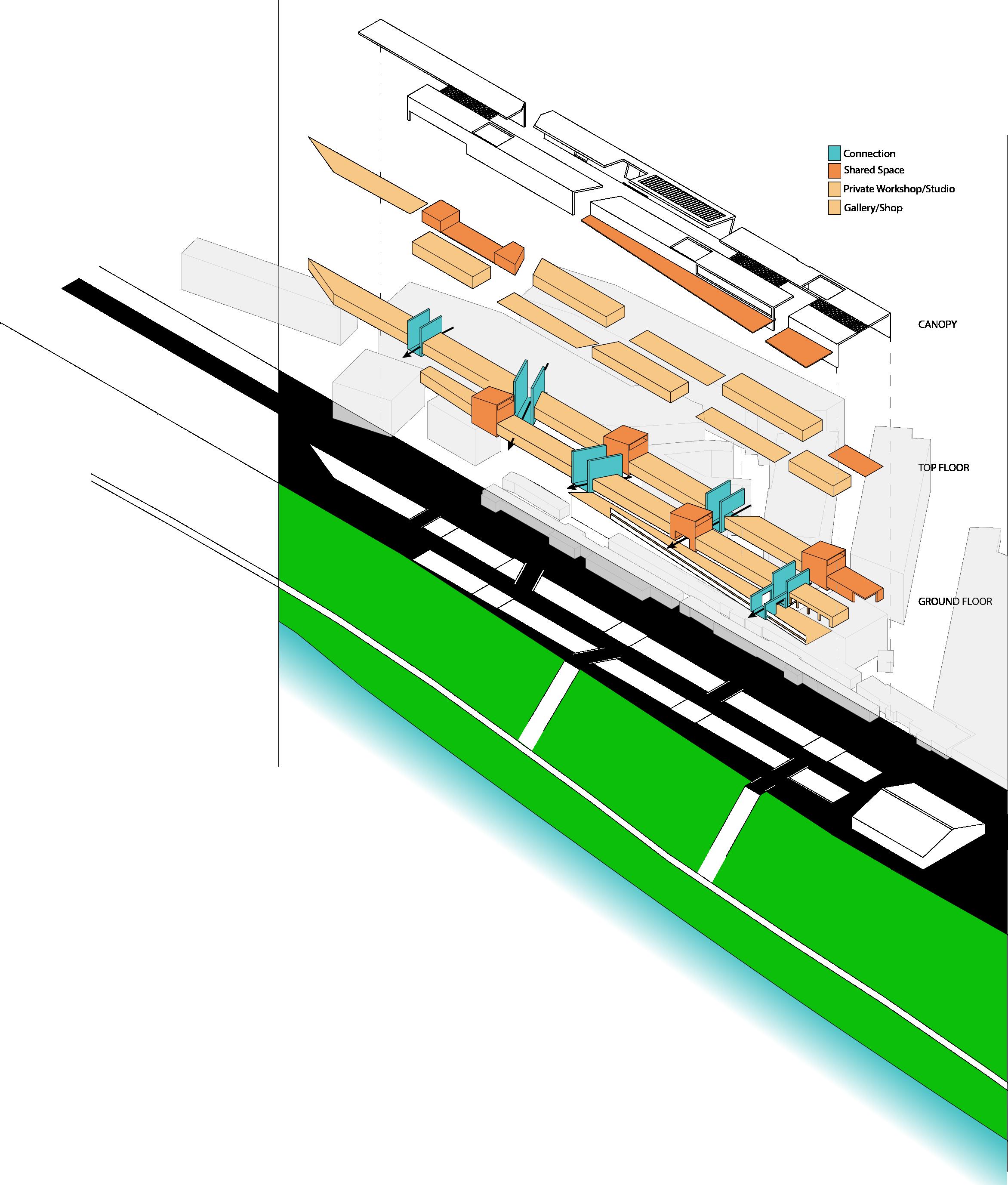 This project was submitted to the C40 competition and was sited in a neglected neighborhood of Rome along the Tiber River. The goal of the project was to create a masterplan that revitalized the neighborhood with green corridors and updated commercial areas. The section of the master plan shown in this portfolio is a proposed addition to an existing market that allows for more artisans and vendors to occupy the space and also create a connection to the river and its recreational path. The new addition also revitalizes the main road that stretches through the market, Via Portuense, by adding more greenery and an updated transportation system that bans cars making it more pedestrian friendly.