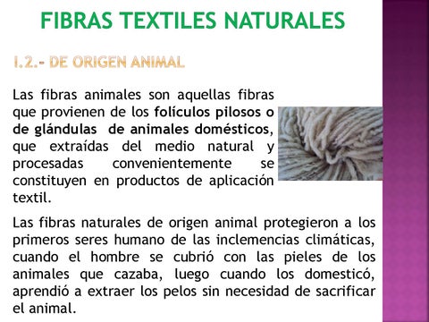 Las fibras animales son aquellas fibras que provienen de los folículos pilosos o de glándulas de animales domésticos, que extraídas del medio natural y procesadas convenientemente se constituyen en productos de aplicación textil. Las fibras naturales de origen animal protegieron a los primeros seres humano de las inclemencias climáticas, cuando el hombre se cubrió con las pieles de los animales que cazaba, luego cuando los domesticó, aprendió a extraer los pelos sin necesidad de sacrificar el animal.