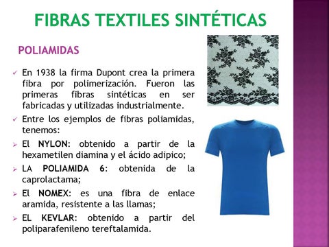 En 1938 la firma Dupont crea la primera fibra por polimerización. Fueron las primeras fibras sintéticas en ser fabricadas y utilizadas industrialmente. Entre los ejemplos de fibras poliamidas, tenemos: El NYLON: obtenido a partir de la hexametilen diamina y el ácido adipico; LA POLIAMIDA 6: obtenida de la caprolactama; El NOMEX: es una fibra de enlace aramida, resistente a las llamas; EL KEVLAR: obtenido a partir del poliparafenileno tereftalamida.