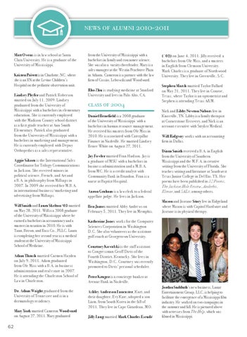 news of alumni 2010-2011 Matt Owens is in law school at Santa Clara University. He is a graduate of the University of Mississippi. Kristen Privett is in Charlotte, NC, where she is an RN at the Levine Children’s Hospital on the pediatric observation unit. Lindsey Phyfer and Patrick Roberson married on July 11, 2009. Lindsey graduated from the University of Mississippi with a bachelors in elementary education. She is currently employed with the Madison County school district as a first grade teacher at Ann Smith Elementary. Patrick also graduated from the University of Mississippi with a bachelors in marketing and management. He is currently employed with Depuy Orthopedics as a sales representative. Aggie Sikora is the International Sales Coordinator for Trilogy Communications in Jackson. She received minors in political science, French, and Art and a B.A. in philosophy from Millsaps in 2007. In 2009 she received her M.B.A. in international business/marketing and advertising from Millsaps. Will Smith and Laura Skelton ‘03 married on May 28, 2011. Will is a 2008 graduate of the University of Miississippi where he earned a bachelors in accountancy and a masters in taxation in 2010. He is with Tann, Brown, and Russ Co., PLLC. Laura is completing her second year as a medical student at the University of Mississippi School of Medicine. Adam Thrash married Carmen Hayden on July 9, 2011. Adam graduated from Ole Miss with a B.A. in business administration and real estate in 2007. He is attending the Charleston School of Law in Charleston. Dr. Adam Wright graduated from the University of Tennessee and is in a dermatology residency. Mary York married Cameron Woodward on August 27, 2011. Mary graduated