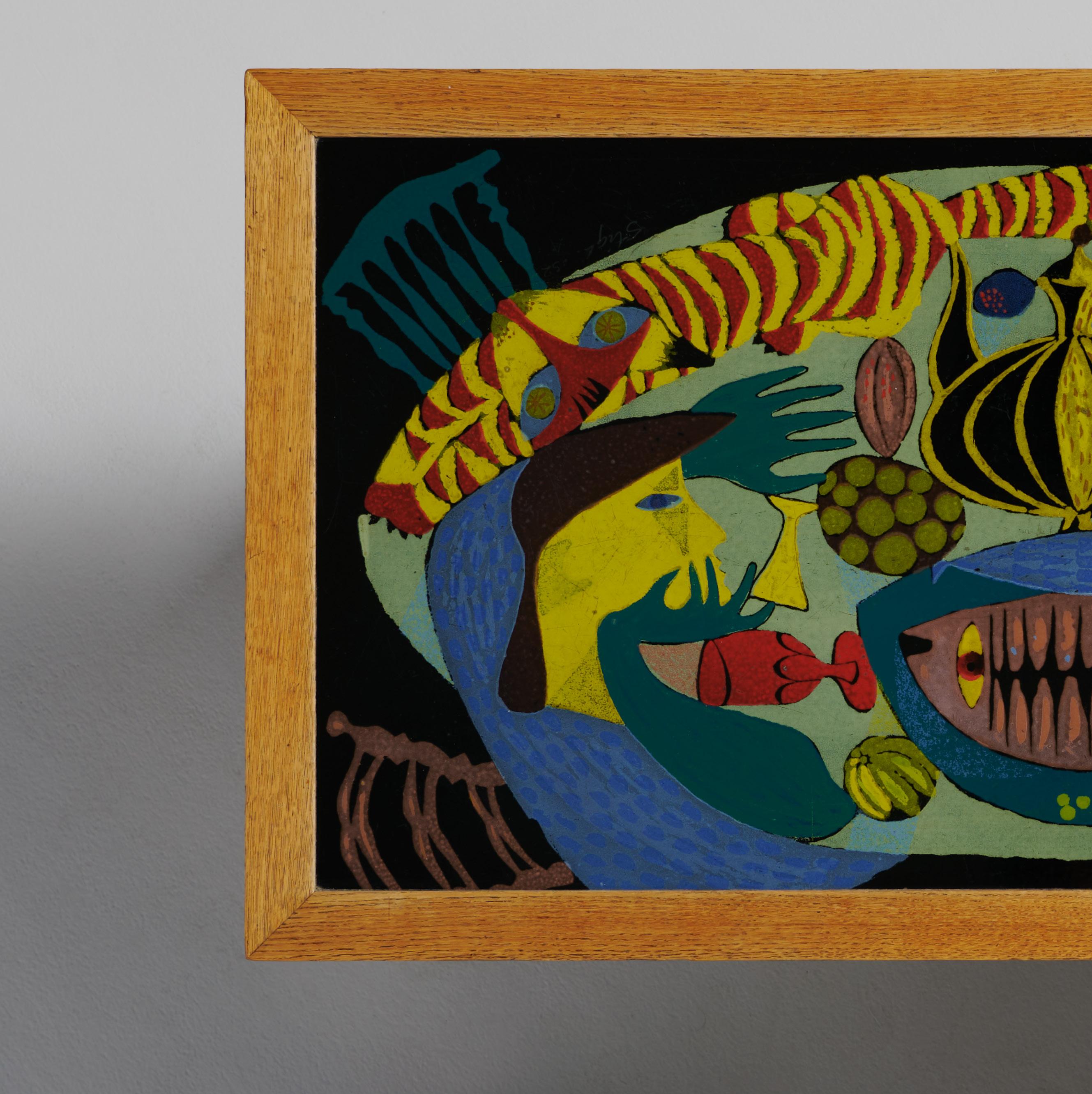In 1947, he began a series of designs for the textile studio of Nordiska Kompaniet, a department store in Stockholm, which are among the very best hand-painted textile designs of the period. Soon after, he also developed some table designs in collaboration with NK’s furniture workshop in Nyköping. The tabletops were enamelled with his illustrative figures. The enamel offered a colour palette of up to seven thousand shades after 5-6 minutes of firing in an oven. Table bases were available in different designs, by different designers.