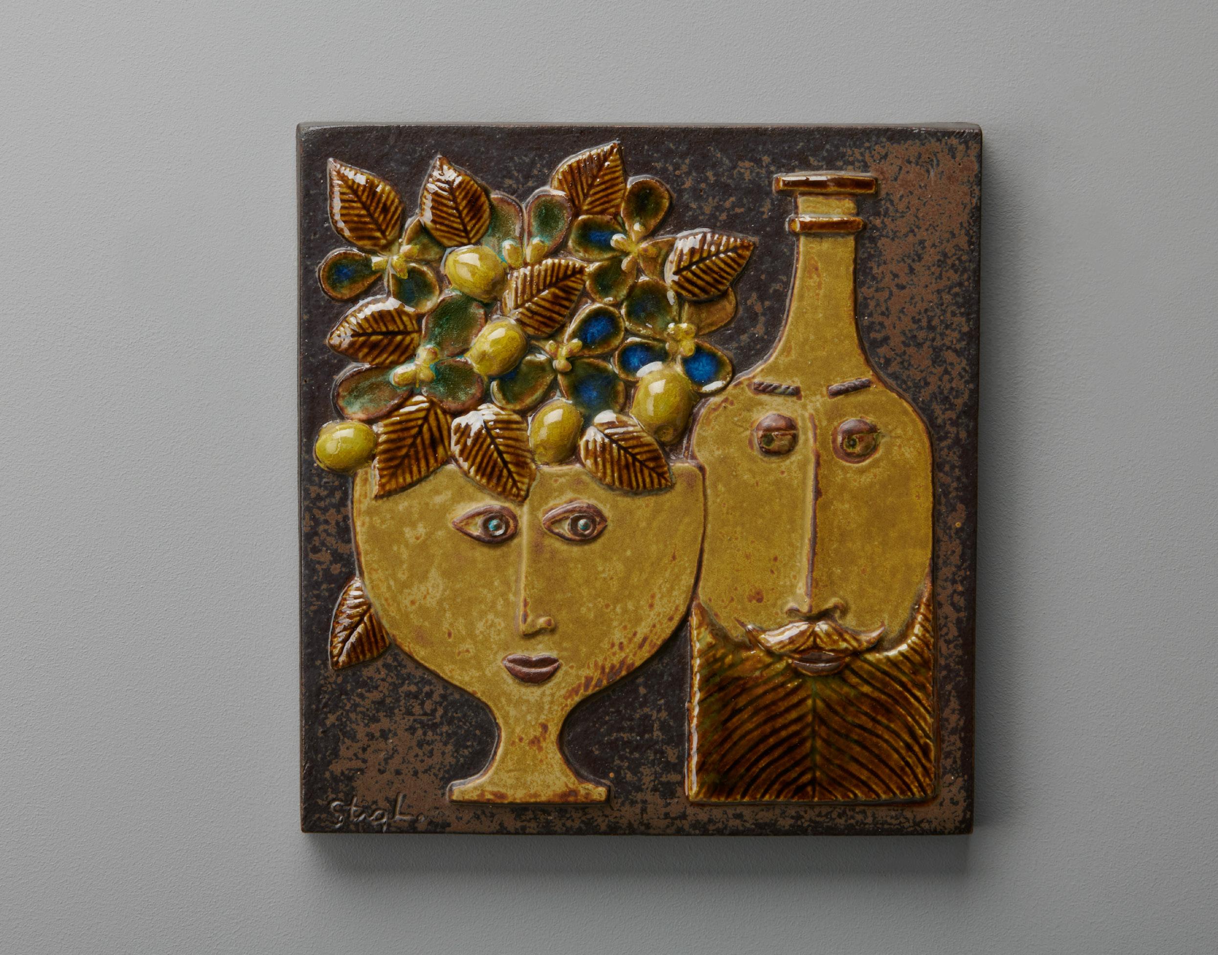 Smaller ceramic walls and tiles were also made, which could be used in domestic rooms. They often contained illustrative figures, repeated in different shades, colours and glazes. Recognisable is the playful style he develops, which can be derived from the children’s book illustrations he made during the same period.