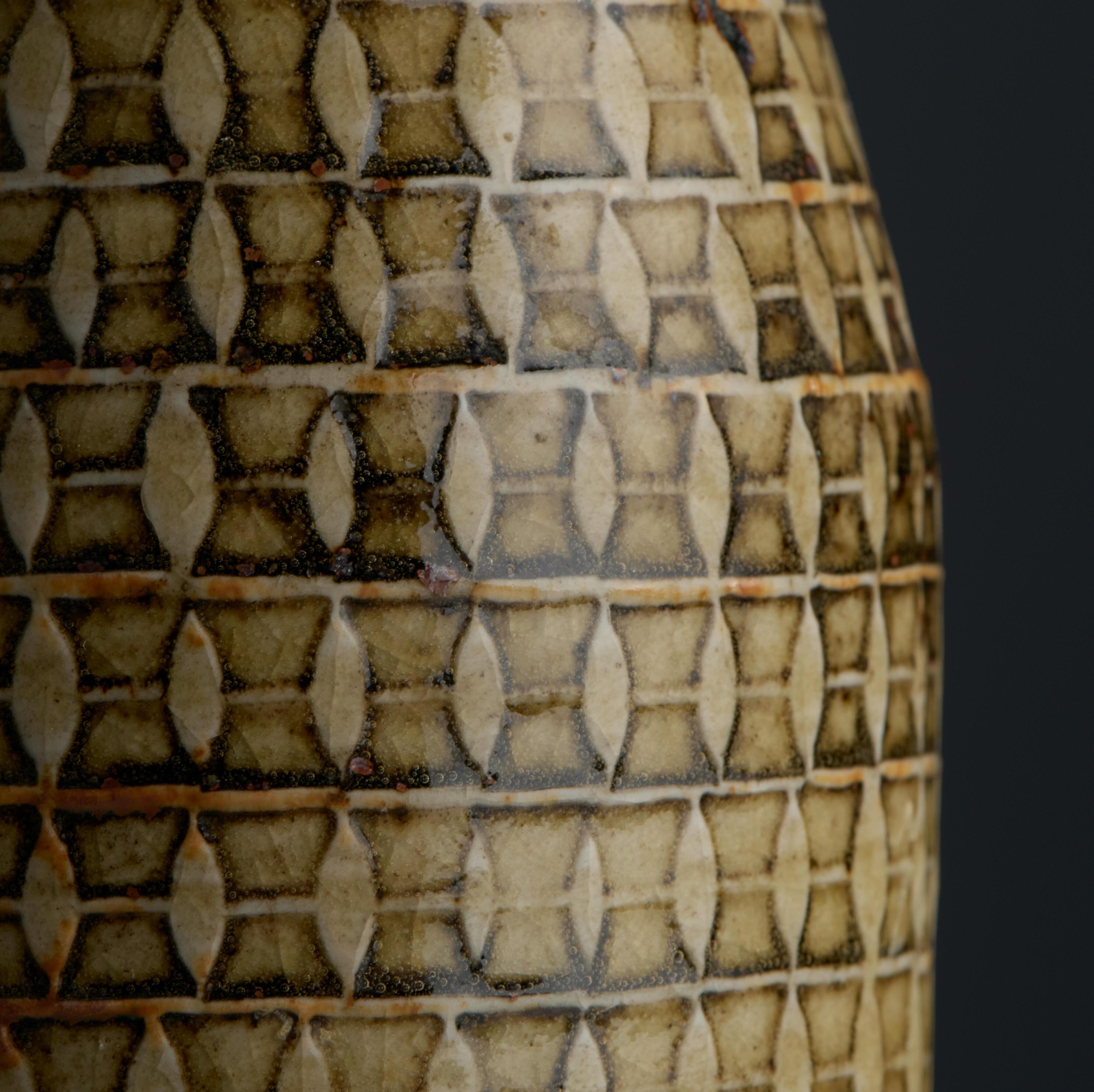 Incised, carved and painted ceramic. Details in a shiny glaze