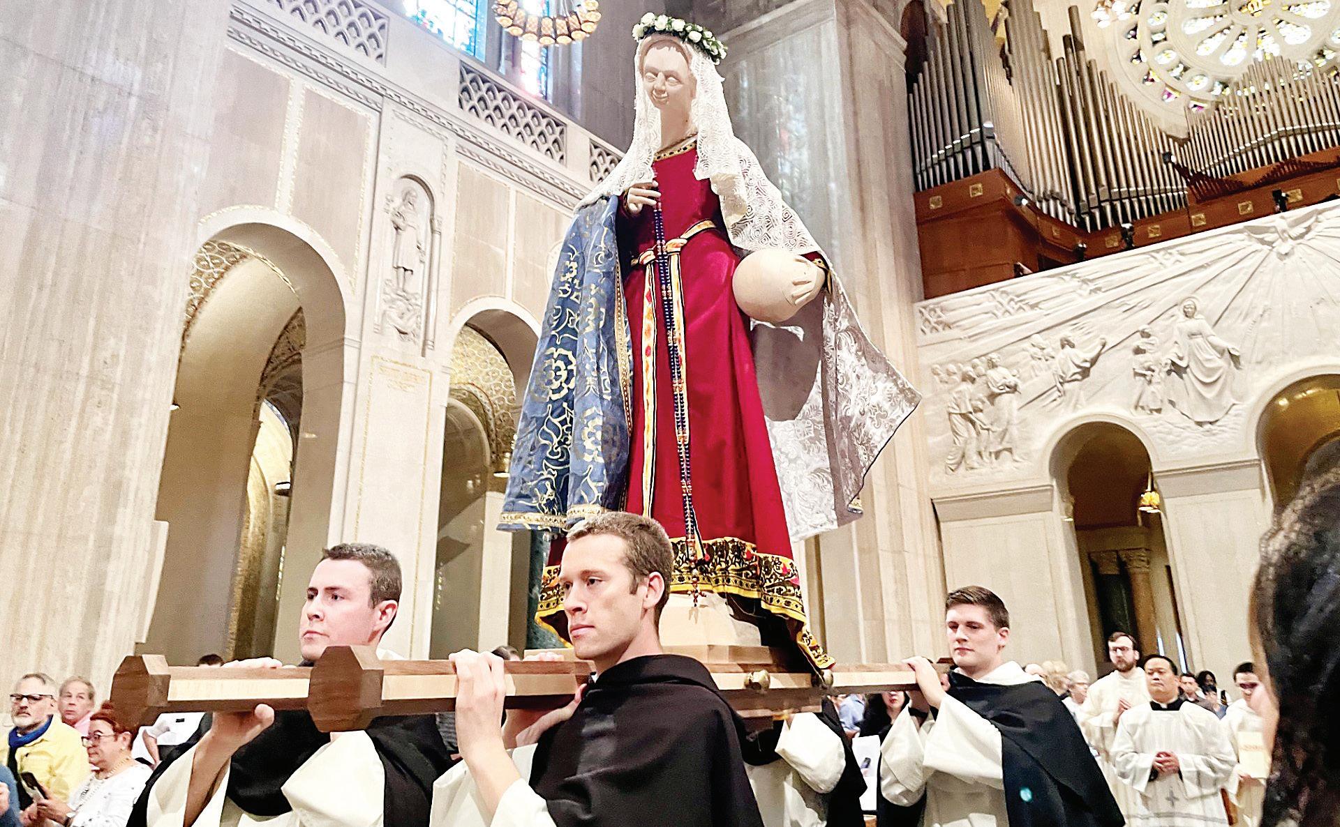 WASHINGTON (OSV News) – Miles de peregrinos de todo el país se reunieron en la Basílica del Santuario Nacional de la Inmaculada Concepción de Washington el 28 de septiembre para honrar a María, la Madre de Dios, y su don del rosario. «Soy todo tuyo, María, soy todo tuyo», cantó la multitud en latín cuando la segunda peregrinación anual del Rosario dominicano comenzó con la procesión de una estatua de María, Reina del Santísimo Rosario. «Todo lo que tengo, Madre de Cristo, todo lo que tengo es tuyo». Más de 3.000 personas se inscribieron en la peregrinación gratuita de un día de duración para celebrar el rosario, organizada por los frailes dominicos de la Provincia de San José y sus cofradías locales de la Cofradía del Santísimo Rosario, una asociación espiritual dedicada al rosario. Frailes y hermanas dominicos salpicaron a una multitud diversa de hombres y mujeres, jóvenes y mayores, personas y familias de diferentes culturas y procedencias. El acto en la basílica, la mayor iglesia católica romana de Norteamérica, incluyó predicación, adoración, confesión, firma de libros, rezo del rosario, inscripción en la cofradía, misa y un concierto nocturno con los Hillbilly Thomists, una banda de bluegrass formada por frailes dominicos. Fundada en 1216 por Santo Domingo de Guzmán, la Orden Dominicana, también conocida como Orden de Predicadores, tiene una relación especial con el rosario: Según la tradición, María se apareció a Santo Domingo, encomendándole la promoción del rosario.