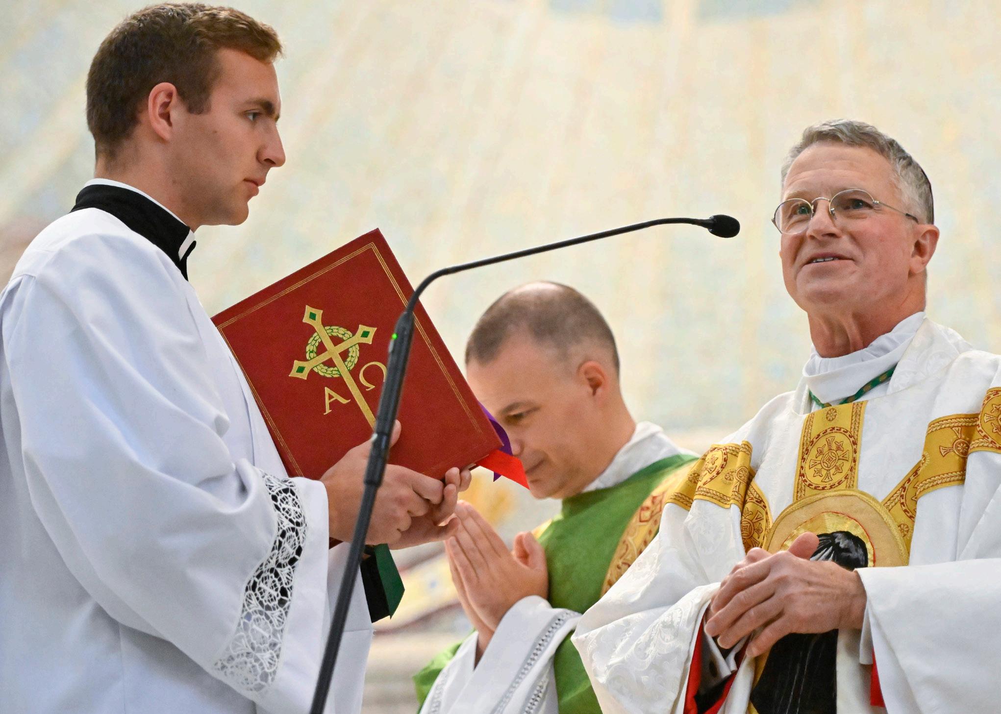 (izq.) Los gemelos Michael y Johnathan Hickey participan en una misa en la Catedral de la Inmaculada Concepción en Fort Wayne, Indiana, el 3 de octubre de 2021. Después de años de vivir vidas similares y compartir intereses similares, los hermanos ahora estudian juntos para el sacerdocio en Mount Seminario de St. Mary en Emmitsburg, Maryland (foto de CNS/Jennifer Barton, Today's Catholic) (der.) Una monja observa cómo se coloca el árbol de Navidad en la Plaza de San Pedro en el Vaticano el 23 de noviembre de 2021. Después de una controver sia sobre la selección del árbol de Navidad del Vaticano de este año, el Vaticano recibirá un árbol de una granja de árboles italiana. (Foto del CNS/Paul Haring)