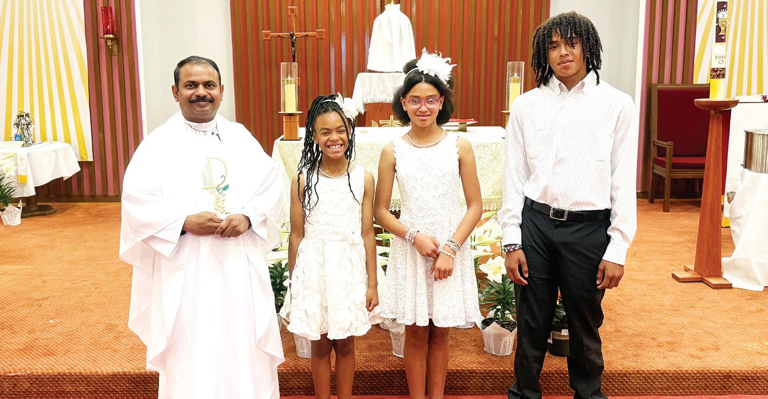 Morgan Purdy, Melissa Farley, Jackson Farley and Mason Farley. Second row, from left: Darcel Phillips, Derek Silva, Jonathan Farley, Steven Kelley, Benjamin Hardy, Jennifer DiFatta, Noelle Carey, Chloe Battles, Layla Farley, Emma Farley and Mary Catherine Pogue. Third row, from left: Robert Calcote, Zachary Robbins, Nathan Polichnia, Sara Daleo, Briana Polichnia, Robin Cumberland, Albree Sanders Florey and Scott Florey. Fourth row: Ken Woodward, faith formation director, Father Augustine Palimattam and Diane Daleo.