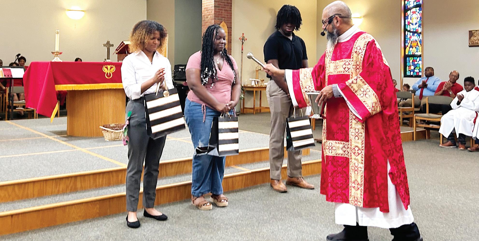 are Dajia Williams, a graduate of Mississippi State University; Father Madanu Vijaya Bhaskar, SVD; and Kameron Fox, a graduate of Jim Hill High School. Not pictured: Hugh Smith and Earnestine Powell. (Photo by Dorothy Ashley)